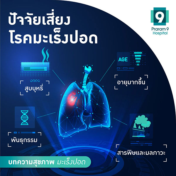 · ฝุ่น PM 2.5 หรือฝุ่นละอองจิ๋วขนาดเล็กที่มีขนาดโมเลกุลเล็กเพียง 2.5 ไมครอน ที่ไม่สามารถมองไม่เห็นด้วยตาเปล่า โดยฝุ่น PM 2.5 จะเพิ่มความเสี่ยงในการเป็นมะเร็งปอดมากขึ้นถึง 1 – 1.4 เท่า โดยเมื่อฝุ่น PM 2.5 เข้าไปในปอดจะทำให้เกิดการอักเสบ และมีการกลายพันธุ์ของสารพันธุกรรม ซึ่งอาจทำให้เกิดมะเร็งปอดขึ้นได้