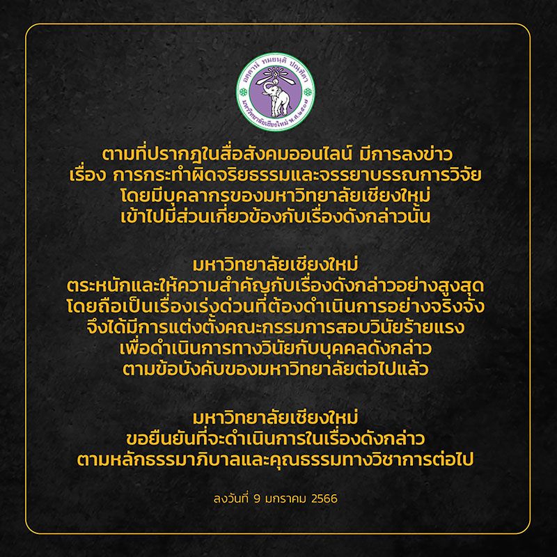วันที่ 9 มกราคม 2566 เพจเฟซบุ๊ก “มหาวิทยาลัยเชียงใหม่ Chiang Mai University” โพสต์ข้อความระบุว่า ตามที่ปรากฏในสื่อสังคมออนไลน์ มีการลงข่าว เรื่อง การกระทำผิดจริยธรรมและจรรยาบรรณการวิจัย โดยมีบุคลากรของมหาวิทยาลัยเชียงใหม่ เข้าไปมีส่วนเกี่ยวข้องกับเรื่องดังกล่าวนั้น