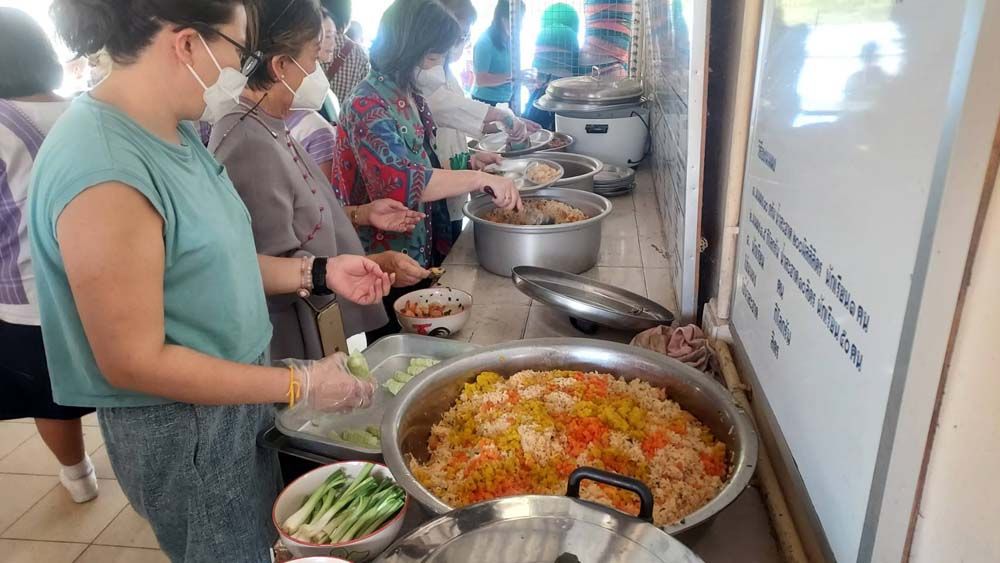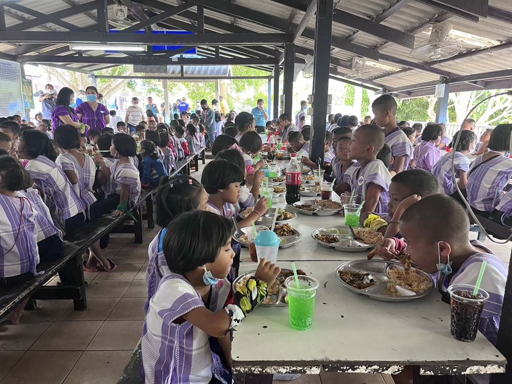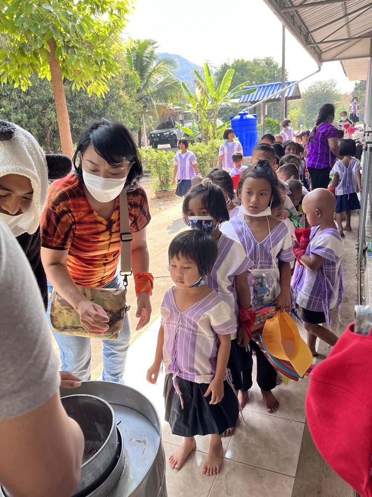 กลุ่มคุณหมอและพยาบาล รวมถึงผู้ประกอบสัมมาชีพอื่นๆ ซึ่งเป็นกัลยาณมิตรของ Mr.Flower ได้ตั้งใจไปผัดข้าวผัด และทำก๋วยเตี๋ยวเส้นใหญ่ผัดซีอิ๊ว โดยผัดกันสดๆ ใหม่ๆ เพื่อให้นักเรียนและคุณครู ได้รับประทานอาหารใหม่สดถูกสุขลักษณะ และอุดมไปด้วยสารอาหารครบถ้วน พี่ๆ ผู้เป็นแม่ครัวอาสาสมัครตั้งใจสรรหาวัตถุดิบที่สด สะอาด ไปเพื่อการนี้โดยเฉพาะ แล้วยังมีความเป็นห่วงเด็กๆ ที่อาจจะแพ้อาหารทะเล เนื่องจากเป็นเด็กที่อยู่บนดอยบริเวณตะเข็บชายแดนไทย-เมียนมา ด้านจังหวัดราชบุรี จึงเตรียมยาสำหรับแก้อาการแพ้ไปด้วย แต่นับว่าเป็นเรื่องดีมาก ที่เด็กนักเรียนทุกคนรับประทานอาหารที่คณะของเราทำให้อย่างเอร็ดอร่อยมีความสุข โดยที่ทุกคนไม่มีปัญหาแพ้อาหารทะเล เพียงแค่นี้คณะของเราก็สบายใจแล้ว แล้วยิ่งได้เห็นรอยยิ้มเสียงหัวเราะอย่างเบิกบานของเด็กๆ ก็ยิ่งทำให้พวกเรามีความสุขมากยิ่งขึ้น