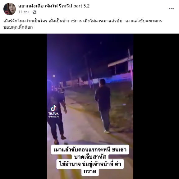 15 ม.ค.66 เพจเฟซบุ๊ก อยากดังเดี๋ยวจัดให้ รีเทิรน์ part 5.2 แชร์คลิปชายคล้ายคนเมา ขับรถชน แล้วโวยวาย “รู้ไหมกูเป็นใคร กูเป็นข้าราชการ” โดยคู่กรณีโวยเป็นข้าราชการแล้วไง พร้อมระบุว่าด้วยว่า ชายคล้ายคนเมา ชนคนบาดเจ็บแล้วพยายามจะหนี
