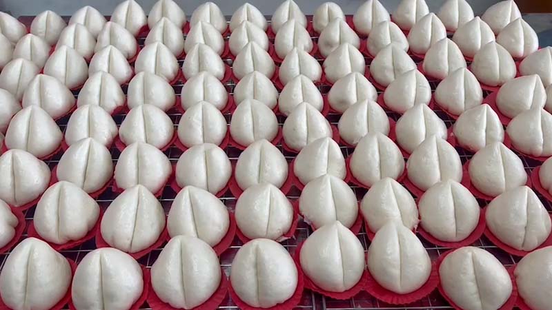 ซึ่งทำออกมาได้เหมือนสิ่วท้อและผลส้มเป็นอย่างมาก นอกจากจะเป็นผลไม้หรือขนมมงคลแล้ว ยังมีราคาที่ถูกกว่า หาซื้อได้ง่ายและเป็นที่ต้องการของตลาด ซึ่งต้องปิดหน้าร้านในช่วงนี้ เพื่อผลิตซาลาเปาสิ่วท้อกับเปาส้มขายให้ทันตามออเดอร์ของลูกค้า ที่สั่งซื้อเข้ามาวันละ 400-500 ลูก สร้างรายได้วันละนับ 10,000 บาทเลยทีเดียว