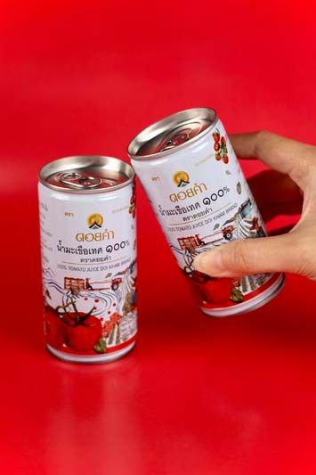 “น้ำมะเขือเทศ 100%” เป็นสินค้าลิมิเต็ด อิดิชั่น มาพร้อมลวดลายบนกระป๋อง สุดพิเศษจากดอยคำ นำเสนอเรื่องราวเส้นทางมะเขือเทศดอยคำผ่านลายเส้นภาพวาด แสดงพื้นที่เพาะปลูกมะเขือเทศที่อุดมสมบูรณ์ในเขตอีสานตอนบน การขึ้นค้าง วิธีการปลูกผลผลิตมะเขือเทศแบบแนวตั้ง รวมถึงรถอีแต๊กยานพาหนะที่เป็นเอกลักษณ์ของเกษตรกรภาคอีสานตอนบน