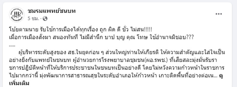 เมื่อวันที่ 29 มกราคม 2566 เพจเฟซบุ๊ก “ชมรมแพทย์ชนบท” โพสต์ข้อความระบุว่า โบ้ยตามนาย รับใช้การเมืองได้ทุกเรื่อง ถูก ผิด ดี ชั่ว ไม่สน!!!!! เมื่อการเมืองสั่งมา สนองทันที ไม่มีสำนึก บาป บุญ คุณ โทษ ใช้อำนาจมิชอบ???