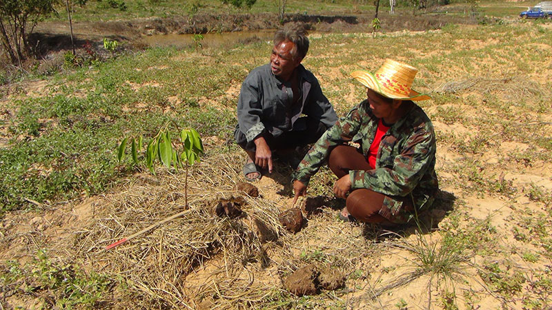 โดยเฉพาะสวนทุเรียนของนายสถิต ประธาน และน.ส.สายยุทธิ์ ปักกาโส สองสามีภรรยา ที่เพิ่งปรับเปลี่ยนจากมันสำปะหลังหันมาปลูกทุเรียน 400 ต้น เพื่อหวังจะหลีกเลี่ยงไม่ให้ช้างป่ามาทำลาย แต่กลับถูกช้างป่าบุกทำลายเสียหายไปมากกว่า 40 ต้น ถึงกับเข่าทรุดเมื่อเห็นสภาพต้นทุเรียนของตัวเอง