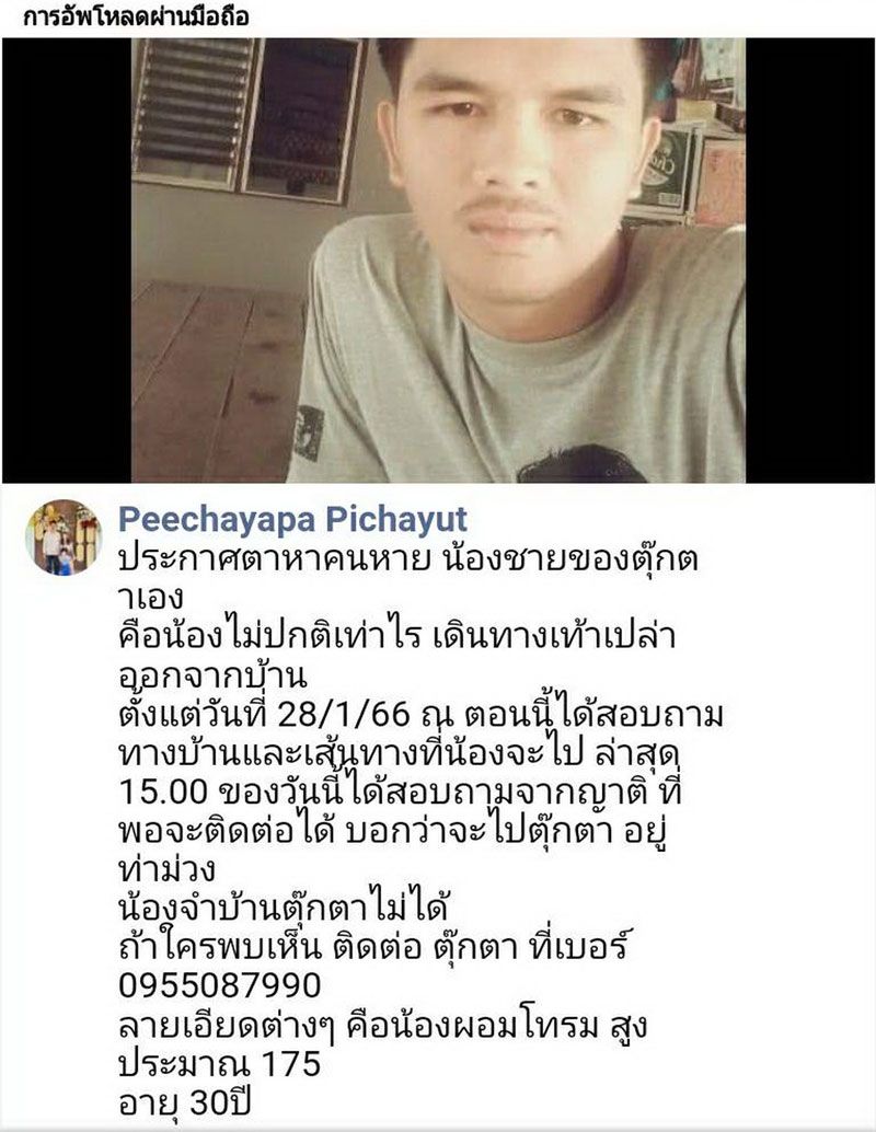 31 ม.ค.66 ผู้สื่อข่ายงานว่า พบผู้ใช้เฟซบุ๊ก นามว่า “Peechayapa Pichayut” ได้นำภาพน้องชายที่หายออกจากบ้านมาโพสต์เพื่อให้ประชาชนชาวกาญจนบุรีและทั่วไปช่วยกันตามหา พร้อมระบุข้อความว่า “ประกาศตาหาคนหาย น้องชายของตุ๊กตาเอง คือน้องไม่ปกติเท่าไร เดินทางเท้าเปล่าออกจากบ้านตั้งแต่วันที่ 28/1/66 ณ ตอนนี้ได้สอบถามทางบ้านและเส้นทางที่น้องจะไป ล่าสุด 15.00 ของวันนี้ได้สอบถามจากญาติ ที่พอจะติดต่อได้ บอกว่าจะไปหาตุ๊กตา อยู่ท่าม่วงน้องจำบ้านตุ๊กตาไม่ได้ ถ้าใครพบเห็น ติดต่อ ตุ๊กตา ที่เบอร์ 0955087990 รายเอียดต่างๆ คือน้องผอมโทรม สูงประมาณ 175 ซม. อายุ 30 ปี