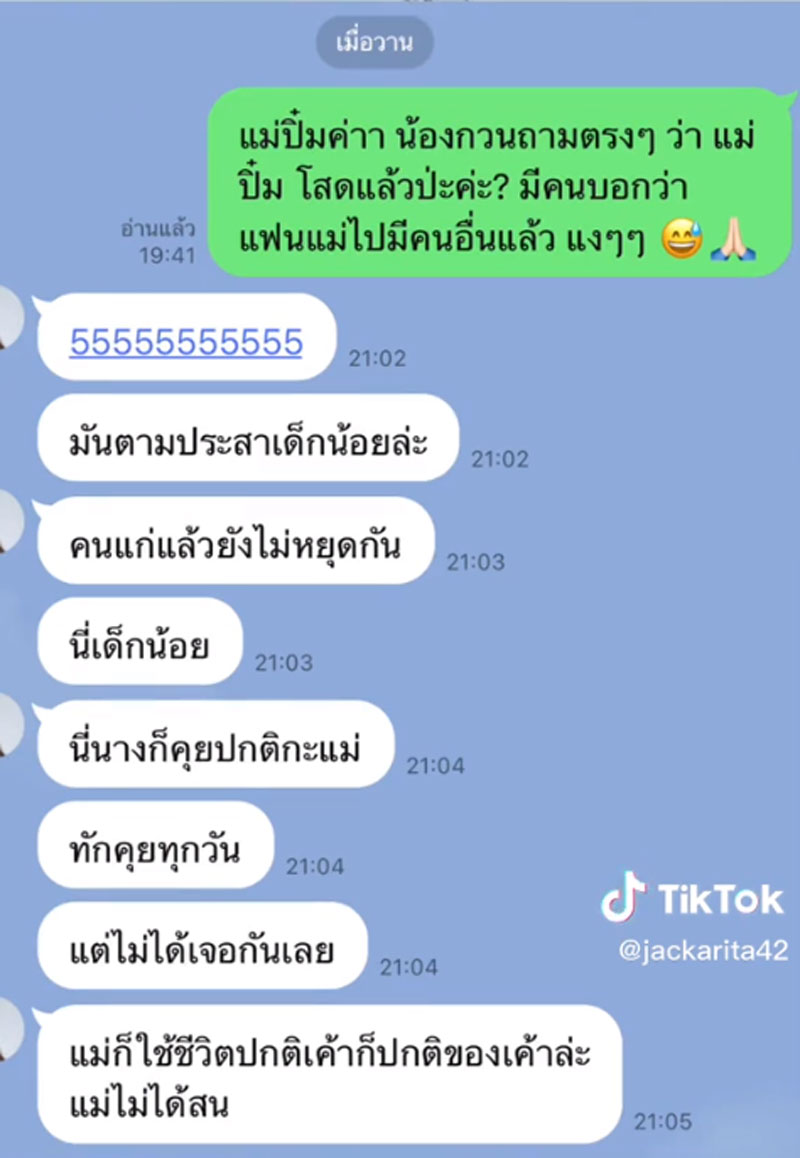 คือเรื่องของเรื่อง เมื่อคืน มีคนโทรมาบอกว่า แม่ปิ๋ม ซีโฟร์ ของเราเนี่ยแหละ โดนแย่งแฟนนักฟุตบอล เค้าก็เล่ารายละเอียดแบบว่า แย่งไปแล้วก็เย้ย นู่น นั่น นี่ ได้ฟังแล้วของขึ้นไง สรุปก็เลยไลน์ไปถามแม่ปิ๋มเลย กลางดึกว่า แม่จริงเปล่า แล้วแม่ปิ๋มก็ตอบมา ตามที่เห็นในไลน์ แม่ปิ๋มก็บอกว่า เออ แม่ก็พอได้ยินมาเหมือนกัน ตอนนี้ไม่ได้เจอกันเลย แต่คุยกันทุกวัน ให้กำลังใจกันตลอด สรุป ก็คือแม่ว่า แม่น่าจะเลิกนะ แล้วก็น่าจะโสดอยู่ตอนนี้ ส่วนเรื่องผู้หญิงเนี่ย ก็เคยมีคนโทรมาเย้ยแม่ปิ๋มเหมือนกัน แม่ก็โกรธ แต่ก็ปล่อยวางไปแล้ว เพราะว่าแฟนเด็ก เค้าอายุยังน้อยอยู่ จะมีแฟนคนใหม่ก็ชั่งเค้า สรุปก็คือว่า มันเป็นเรื่องมากจากแม่ปิ๋ม ซีโฟร์ มันไม่เกี่ยวอะไรกับคู่ที่เค้าเป็นข่าวอยู่ตอนนี้เลย