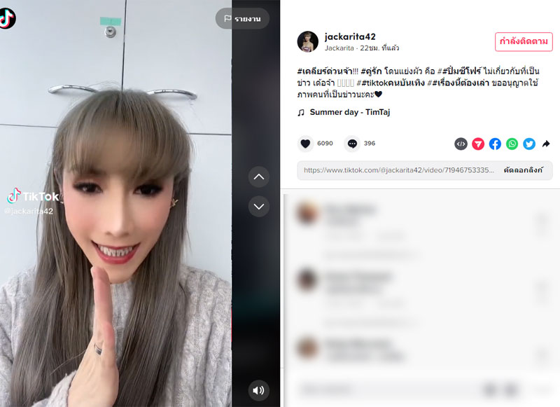 ล่าสุด แจ็คเกอรีน ก็ได้ออกมาอัดคลิปเคลียร์ข่าวพร้อมเฉลยแล้วว่า คนในวงการบันเทิงที่พูดถึงนี้คือ ปิ๋ม ซีโฟร์ โดยระบุว่า ขออัดคลิปเคลียร์ข่าวด่วนเลยนะคะ สืบเนื่องมาจาก เมื่อคืนนี้ที่โพสต์ในติ๊กต็อกบอกว่า คนที่แย่งผัวชาวบ้านเค้าคิดยังไงก่อน ได้ยินเรื่องแล้วอยากจะหยุมหัว โห๋ เท่านั้นแหละใต้คอมเม้นท์ เพิ่งมาดูตอนเช้านี่แหละค่ะ คนโยงไปคู่ที่กำลังเป็นข่าวอยู่เลย คู่ที่ฮอต ที่เค้ามีกงมีกิ๊ก ที่เค้าว่ากันไป สรุปแล้ว ไม่ใช่นะ!