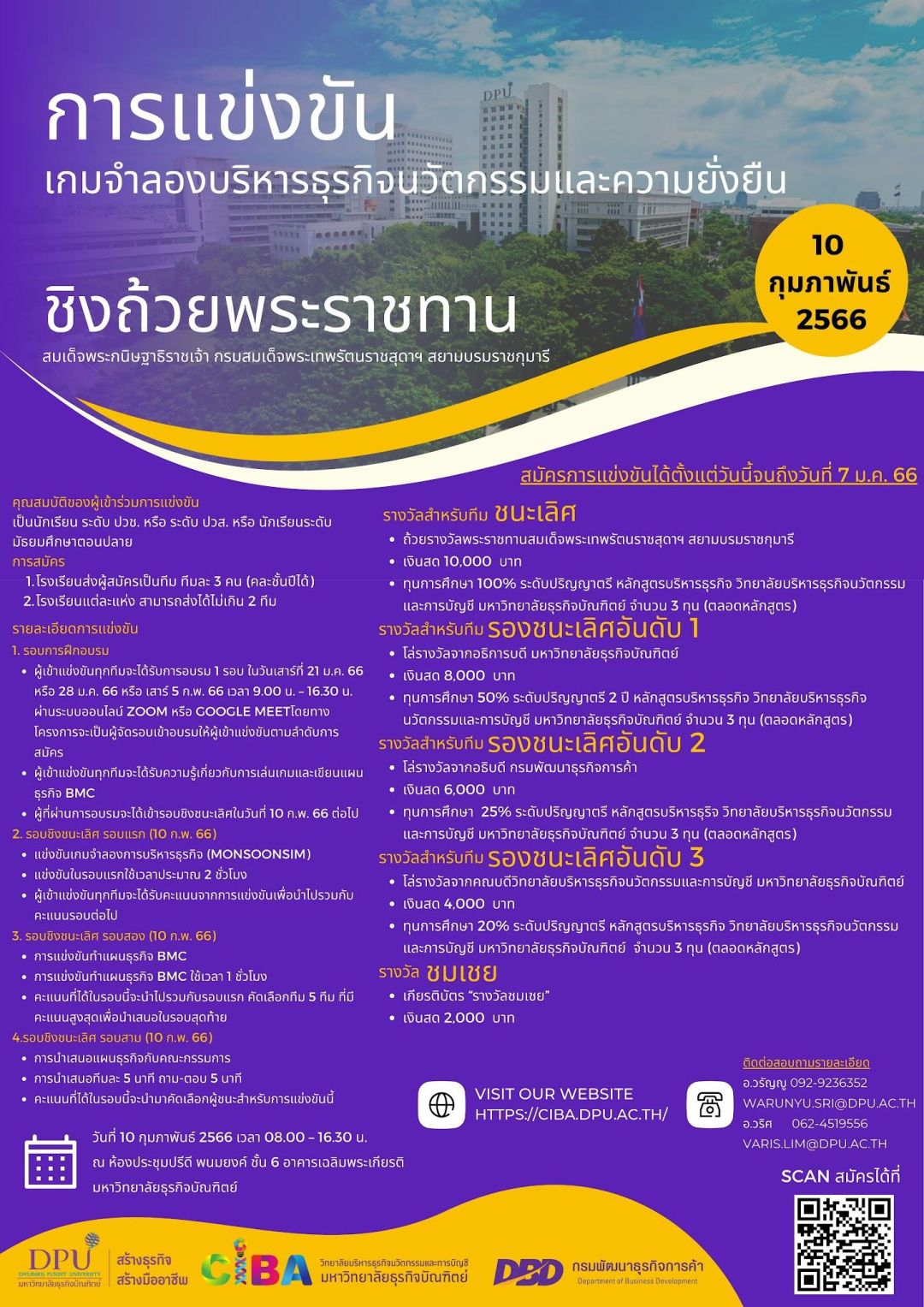 วิทยาลัยบริหารธุรกิจนวัตกรรมและการบัญชี มหาวิทยาลัยธุรกิจบัณฑิตย์ (CIBA DPU) ขอเชิญน้อง ๆ นักเรียนในระดับ ปวช. ปวส. และ ม.ปลาย เข้าร่วมการแข่งขันเกมจำลองบริหารธุรกิจนวัตกรรมและความยั่งยืน ชิงถ้วยพระราชทาน สมเด็จพระกนิษฐาธิราชเจ้า กรมสมเด็จพระเทพรัตนราชสุดาฯ สยามบรมราชกุมารี และเงินรางวัลมูลค่ารวม 30,000 บาท พร้อมทุนการศึกษาตลอดหลักสูตร โดยผู้เข้าแข่งขันจะได้รับการฝึกอบรม ได้รับความรู้เกี่ยวกับการเล่นเกม และการเขียนแผนธุรกิจ BMC ซึ่งจะจัดขึ้นในวันที่ 10 กุมภาพันธ์ 2566 เวลา 08.00-16.30 น. ณ ห้องประชุมปรีดี พนมยงค์ อาคารเฉลิมพระเกียรติ มหาวิทยาลัยธุรกิจบัณฑิตย์