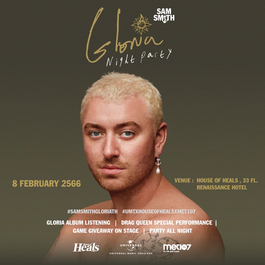 ล่าสุดทาง Universal Music Thailandต่อยอดความปังของอัลบั้ม “Gloria” จับมือกับ House Of Heals และ คลื่นเพลงสากลสุดฮิต MET107 ร่วมกันจัดปาร์ตี้เปิดอัลบั้มสุดเอ็กซ์คลูซีฟกับงาน“Sam Smith Gloria Night Party” ขึ้นมา ในคืนวันพุธที่ 8 กุมภาพันธ์ 2566 ที่ House Of Heals, ชั้น 33 โรงแรม Renaissance พร้อมชวนแฟนเพลงทุกคนมาร่วม Enjoyกันในงานปาร์ตี้เปิดตัวอัลบั้ม “Gloria”แม้งานนี้“Sam Smith” จะไม่ได้บินมาร่วมปาร์ตี้ด้วย แต่การันตีความปังจากบรรดา Real Fan ที่ขนคอสตูมเตรียมมาเสิร์ฟความสนุก ความแซ่บ จัดเต็มทุก Area แน่นอนงานนี้แฟนๆ “Sam Smith” ที่สนใจสามารถร่วมลุ้นรับบัตรเข้างานจำนวน 5 รางวัล รางวัลละ 2 ใบ (พร้อม Complimentary Drink) ร่วมสนุกง่าย ๆ เพียงทำตามกติกาดังนี้