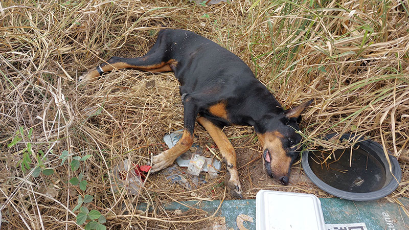 ในที่เกิดเหตุห่างจากถนนลาดยางเข้าไปประมาณ 50 เมตร พบสุนัขสายพันธุ์ “โดเบอร์แมน” สีดำ อายุประมาณ 5 ปี โดยที่ขาหลังทั้ง 2 ข้างถูกพันด้วยเทปกาวติดไว้ ขณะที่ช่วงหัวมีแผลเจาะขนาดใหญ่จำนวน 2 แผล คล้ายถูกตีด้วยของแข็งมีเลือดไหลซึมนอนอยู่