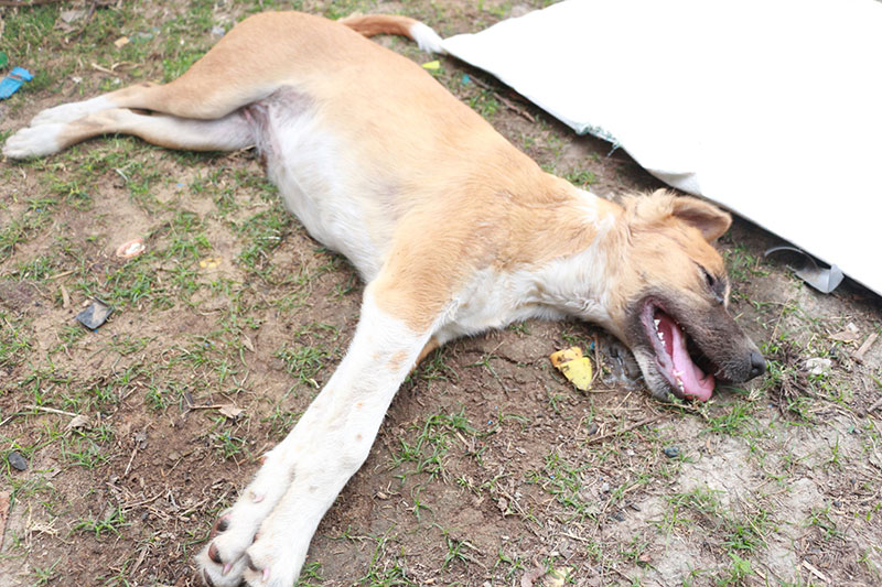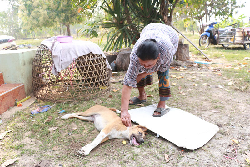 นางไสว นาคนวล อายุ 60 ปี ชาวบ้านน้อยหนองแก บอกว่า เมื่อประมาณ 2 สัปดาห์ที่ผ่านมา สุนัขที่เลี้ยงไว้ทั้งหมด 3 ตัว เริ่มอาการป่วยผิดปกติโดยไม่ทราบสาเหตุและตายไปในวันเดียวกัน 2 ตัว มีจากนั้น วันที่ 5 ก.พ.ที่ผ่านมา สุนัขเพศเมีย อายุ 3 เดือน ก็เริ่มมีอาการซึมผิดปกติไม่มีเรี่ยวแรง และมีอาการชักเก็งน้ำลายฟูมปาก ตอนแรกคิดว่าถูกวางยาเบื่อก็พยายามเอาไข่ไก่ดิบให้กิน แต่อาการก็ไม่ดีขึ้นตอนนี้นอนซมไม่กินข้าวกินน้ำ