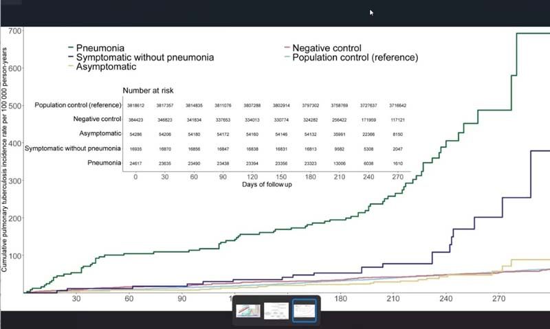 ผลการวิจัยความเสี่ยงเป็นวัณโรคของผู้ป่วยโควิด-19 คณะวิจัยได้เริ่มเก็บข้อมูลการติดตามการกินยารักษาวัณโรคในพื้นที่เขตสุขภาพที่ 12 ใน 7 จังหวัดภาคใต้ได้แก่ จังหวัดตรัง พัทลุง สตูล สงขลาปัตตานี นราธิวาส และยะลา โดยทดลองในผู้ป่วยกว่า 2 หมื่นคน จากประวัติการรักษาของผู้ป่วยที่เป็นอาสาสมัครทุกเคส ซึ่งมาจากผู้ป่วยวัณโรคส่วนใหญ่มักมีประวัติเคยรับการรักษาโควิด-19 แบบผู้ป่วยใน ซึ่งโดยพื้นฐานแล้วคนไทยประมาณ 1 ใน 3 มีการติดเชื้อวัณโรคแต่ไม่มีอาการใดๆ และไม่แพร่เชื้อให้ผู้อื่นเรียกว่าเป็นวัณโรคแฝง และเมื่อนำข้อมูลการลงทะเบียนผู้ป่วยโรคโควิด-19และผู้ป่วยวัณโรคมาศึกษาย้อนหลัง เพื่อเปรียบเทียบอุบัติการณ์การเป็นวัณโรคปอดในผู้ป่วยปอดบวมจากโควิด-19 ที่ออกจากโรงพยาบาลแล้ว กับอุบัติการณ์การเป็นวัณโรคปอดในคนทั่วไปที่ไม่ติดโควิด-19 โดยจากการติดตามข้อมูลผู้ป่วยทุกรายอย่างน้อย 6 เดือน พบว่าผู้ป่วยปอดบวมจากโควิด-19 หลังได้รับการรักษาจนหายดีและออกจากโรงพยาบาลแล้ว จะมีความเสี่ยงที่จะเป็นวัณโรคปอดได้มากกว่าคนทั่วไป