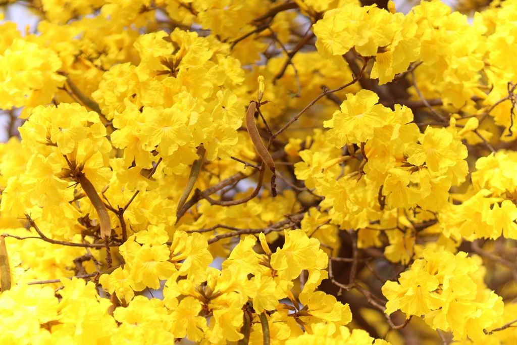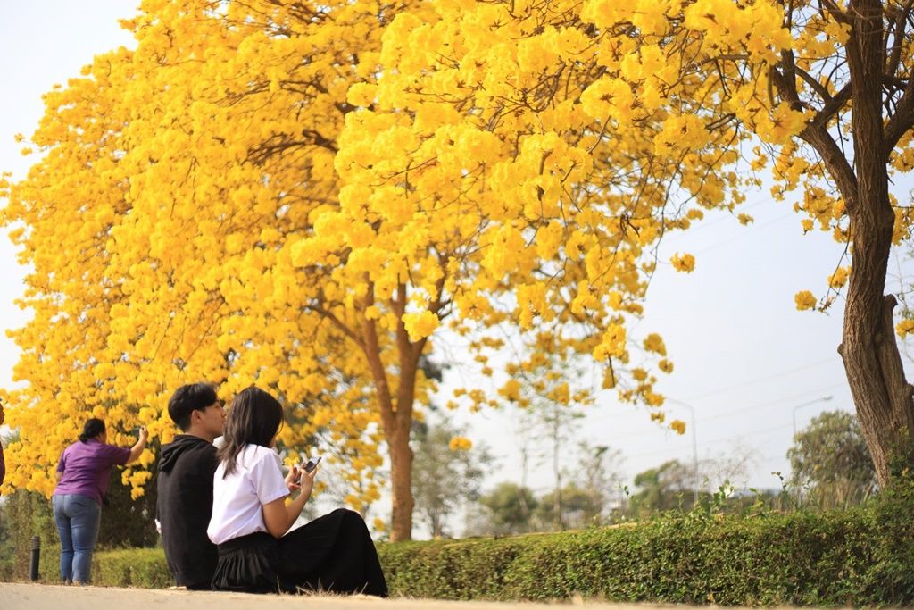 วันที่ 9 ก.พ.66 ผู้สื่อข่าวรายงานบรรยากาศในช่วงฤดูหนาวและกำลังจะพลัดฤดูกาลเริ่มเข้าสู่ฤดูร้อนในช่วงปลายเดือนกุมภาพันธ์นี้ ได้มีดอกไม้ยืนต้นหลากหลายชนิดกำลังออกดอกงดงามมาก โดยเฉพาะดอกเหลืองเชียงราย ต้นไม้ชนิดใกล้เคียงกับเหลืองปรีดียาธร กำลังเริ่มออกดอกเหลืองบานสะพรั่งอย่างงดงามหลายจุด โดยเฉพาะที่มหาวิทยาลัยราชภัฏพิบูลสงคราม อ.เมืองพิษณุโลก ต้นเหลืองเชียงรายที่ปลูกริมแนวถนนหลายจุด กำลังออกดอกเหลืองสวยงามเป็นอย่างมาก ซึ่งขณะนี้เหลืองเชียงรายได้ทิ้งใบทั้งหมด บนกิ่งก้านเต็มไปด้วยดอกเหลืองสด หลายคนชื่นชอบแวะถ่ายรูป โดยเฉพาะนักศึกษามามหาวิทยาลัยราชภัฏพิบูลสงครามและประชาชนทั่วไปต่างแวะมาถ่ายรูปกันอย่างงามตา และคาดว่าภายใน 1 สัปดาห์ดอกเหลืองเชียงรายก็บานเต็มพื้นที่สวยงาม