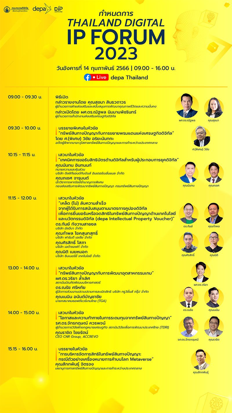 Thailand Digital IP Forum 2023 เป็นกิจกรรมเผยแพร่ความรู้และความตระหนักรู้ให้กับผู้ประกอบการวิสาหกิจขนาดกลางและขนาดย่อม ผู้ประกอบการวิสาหกิจเริ่มต้น นักลงทุน บุคลากรทางการศึกษา หรือผู้สนใจเกี่ยวกับการใช้ประโยชน์และการคุ้มครองสิทธิในทรัพย์สินทางปัญญาด้านดิจิทัล มีการนำเสนอผลงานจากผู้ประกอบการด้านดิจิทัลที่ได้รับการส่งเสริมทรัพย์สินทางปัญญาด้านดิจิทัล โดยเฉพาะอย่างยิ่งประเด็นการขอรับสิทธิบัตรหรืออนุสิทธิบัตรด้านดิจิทัล สำหรับผู้เข้าร่วมชมการถ่ายทอดสดจะได้รับฟังการบรรยายพิเศษในหัวข้อ “ทรัพย์สินทางปัญญากับการขยายพรมแดนแห่งเศรษฐกิจดิจิทัล” โดย ศ.(พิเศษ) วิชัย อริยะนันทกะ อดีตผู้พิพากษาอาวุโสศาลทรัพย์สินทางปัญญาและการค้าระหว่างประเทศกลางนอกจากนี้ยังมีเสวนาในหัวข้อต่าง ๆ ที่น่าสนใจ อาทิ เทคนิคการขอรับสิทธิบัตรด้านดิจิทัล สำหรับผู้ประกอบการยุคดิจิทัล, เคล็ด (ไม่) ลับความสำเร็จจากผู้ได้รับการสนับสนุนตามมาตรการคูปองดิจิทัลเพื่อการยื่นขอรับหรือจดสิทธิในทรัพย์สินทางปัญญาด้านเทคโนโลยีและนวัตกรรมดิจิทัล(depa Intellectual Property Voucher), ทรัพย์สินทางปัญญากับการพัฒนาอุตสาหกรรมเกม, “โอกาสและความท้าทายในการระดมทุนจากทรัพย์สินทางปัญญาและปิดท้ายด้วยการบรรยายในหัวข้อ “การบริหารจัดการสิทธิในทรัพย์สินทางปัญญา: กรณีตัวอย่างเครื่องหมายการค้าบนโลก Metaverse
