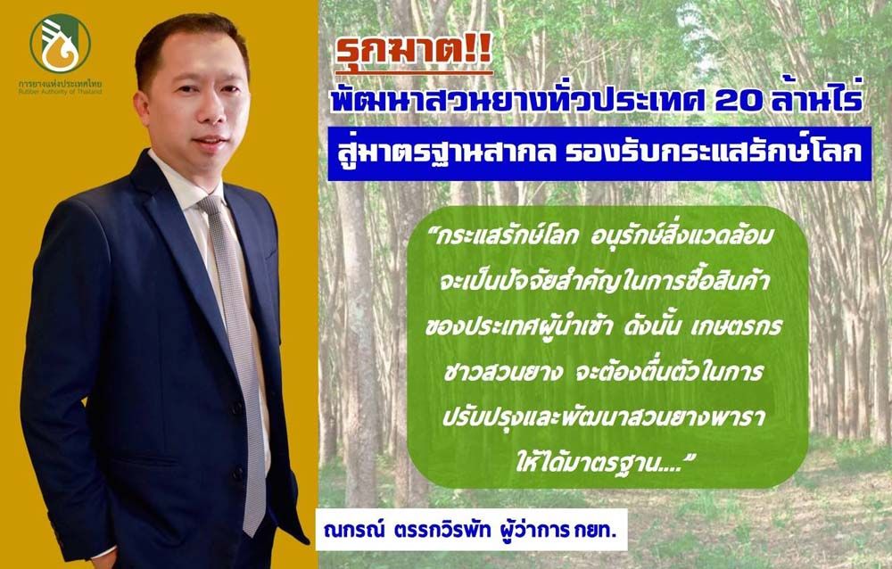 กยท.เร่งขับเคลื่อนมาตรฐานสากลการทำสวนยางพาราตามกระแสรักษ์โลก ยืนยันสวนยางทั้วประเทศ20ล้านไร่ต้องผ่านมาตรฐาน มอก. 14061 การันตีภายในปี 2571 ต้องให้ได้ไม่น้อยกว่า 10 ล้านไร่ เผยเป็นโอกาสทองของประเทศไทยที่มีศักยภาพเหนือเพื่อนบ้านในการพัฒนาก้าวสู่ตลาดยางพรีเมี่ยม ไร้คู่แข่ง ขายได้ในราคาสูงและมีตลาดรองรับที่แน่นอน