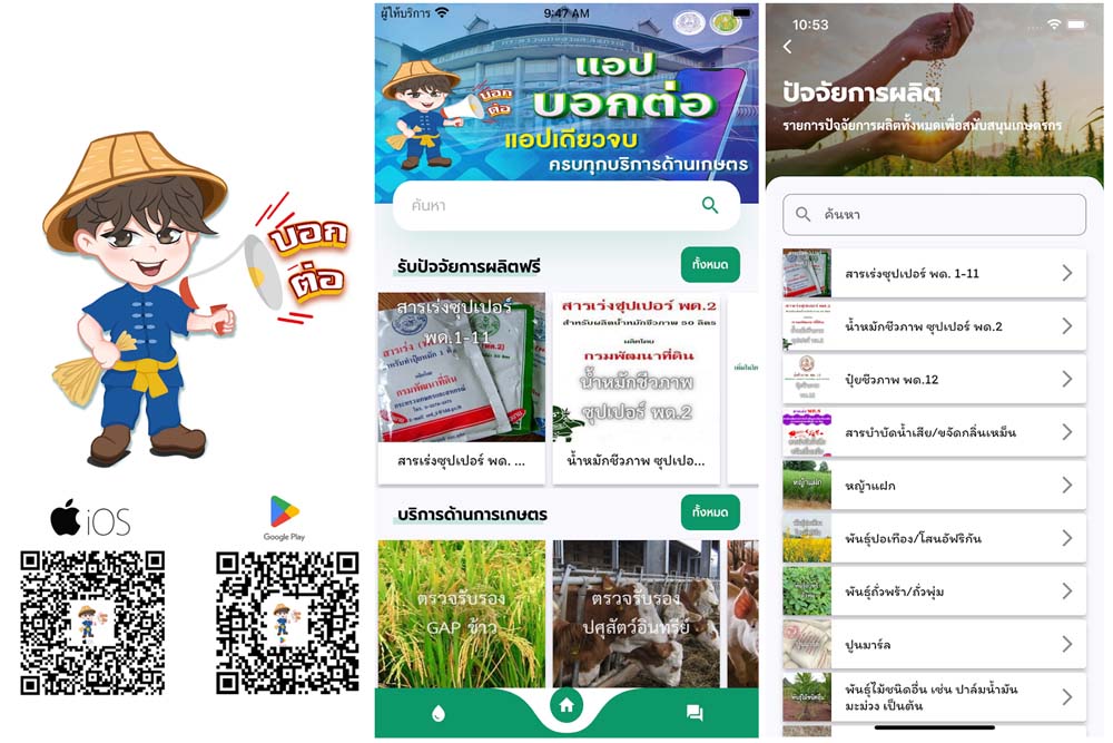 ทั้งภาครัฐ และเอกชน ในการนำข้อมูลไปใช้ประโยชน์ ทั้งการวางแผนบริหารจัดการ การแก้ไขปัญหา ตลอดจนการพัฒนาภาคการเกษตรของประเทศ สศก. จึงได้พัฒนาแอปพลิเคชั่น “บอกต่อ” เพื่อให้เกษตรกรและผู้สนใจสามารถเข้าถึงบริการของกระทรวงเกษตรและสหกรณ์ แบบเบ็ดเสร็จ ณ จุดเดียว (One stop service)โดยให้บริการด้วยชุดเมนูหลักต่างๆ ครอบคลุมมากกว่า 50 บริการ ดังนี้ รับปัจจัยการผลิตฟรีเช่น สารเร่งซุปเปอร์ พด. น้ำหมักชีวภาพปุ๋ยชีวภาพ หญ้าแฝก พันธุ์พืช พันธุ์สัตว์ สารควบคุมแมลงศัตรูพืช วัสดุการเกษตร ด้านกองทุน การติดต่อขอคำปรึกษา ขอคำแนะนำ ทั้งกองทุน FTA กองทุนสงเคราะห์เกษตรกร กองทุนหมุนเวียนเพื่อการกู้ยืมแก่เกษตรกรและผู้ยากจน การขอรับบริการ เช่น การตรวจรับของ GAP อินทรีย์ทั้งพืช ปศุสัตว์ ประมง ตรวจรับรองมาตรฐานหม่อนไหม บริการวิเคราะห์คุณภาพอาหารสัตว์ การให้บริการรับจดทะเบียน การตรวจสอบดินเพื่อการเกษตร ให้บริการผสมเทียม การตรวจสอบรายชื่อในเขตปฏิรูปที่ดิน ศูนย์เรียนรู้ให้คำแนะนำประชาชน การให้บริการฝนหลวง งานวิจัยต่างๆ รวมถึงบริการคำแนะนำ ร้องเรียน ร้องทุกข์ของกระทรวงเกษตรและสหกรณ์ การช่วยเหลือ เช่น การจ่ายเงินช่วยเหลือผู้ประสบภัยพิบัติทางธรรมชาติ ทั้งพืช ปศุสัตว์ ประมง การช่วยเหลือเกษตรกรผู้ประสบภัยโรคใบด่างมันสำปะหลัง การช่วยเหลือเกษตรกรผู้ประสบภัยโรค AFS ในสุกร มาตรการและนโยบายช่วยเหลือจากภาครัฐ มาตรการช่วยเหลือด้านการผลิต การประกันรายได้ เยียวยาเกษตรกร เป็นต้น นอกจากนี้ ยังมีข้อมูล ราคาสินค้าเกษตรที่สำคัญ เป็นข้อมูลราคารายสัปดาห์ ภาวะเศรษฐกิจการเกษตร ซึ่งมีสถานการณ์สินค้าผลิตและการตลาดสินค้าเกษตร รวมถึงมีข้อมูลการ พยากรณ์สภาพอากาศ ให้เกษตรกรได้ใช้ในการวางแผนการเพาะปลูกอีกด้วย