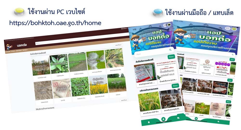 ทั้งนี้ สศก. หวังเป็นอย่างยิ่งว่า แอปพลิเคชั่น “บอกต่อ” จะเป็นอีกหนึ่งเครื่องมือเนวิเกเตอร์ที่อำนวยความสะดวกกับเกษตรกรและผู้สนใจ รวมถึงหน่วยงานต่างๆ ที่ต้องการข้อมูลและขอรับบริการของกระทรวงเกษตรและสหกรณ์ โดยหลังจากนี้ สศก. จะมีการจัดอบรมให้กับหน่วยงานต่างๆ ของกระทรวงเกษตรและสหกรณ์ เพื่อร่วมเป็นผู้ดูแลแอปพลิเคชั่นในชุดเมนูที่เกี่ยวข้องให้ทันสมัยและเป็นปัจจุบันตลอดเวลา โดยเกษตรกรและทุกท่านที่สนใจ สามารถดาวน์โหลดแอปพลิเคชั่นผ่านระบบ Android และระบบ IOS รวมถึงใช้งานผ่านคอมพิวเตอร์ทั่วไปได้ที่ https://bohktoh.oae.go.th สอบถามข้อมูลเพิ่มเติมได้ที่ศูนย์สารสนเทศการเกษตร สำนักงานเศรษฐกิจการเกษตร โทรศัพท์ 02-5612870 Email : prcai@oae.go.th