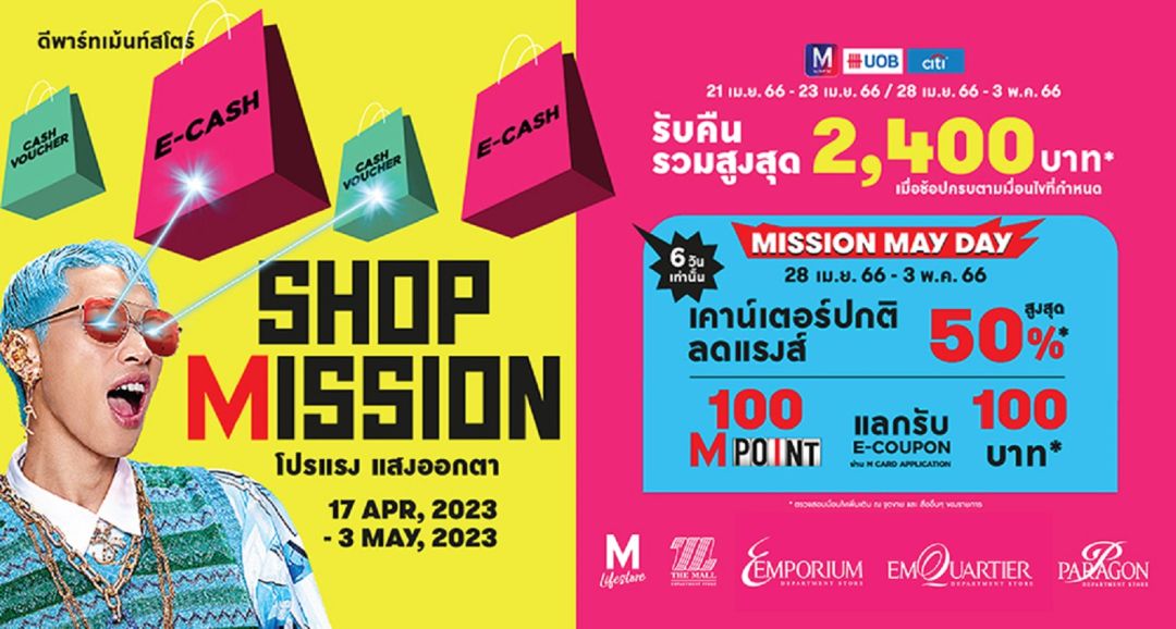 ห้างสรรพสินค้าเดอะมอลล์และ เดอะมอลล์ไลฟ์สโตร์ทุกสาขา, เอ็มโพเรียม,เอ็มควอเทียร์ และ พารากอน ดีพาร์ทเม้นท์สโตร์ ร่วมกับธนาคารยูโอบี จัดแคมเปญ“SHOP MISSION”โปรแรง แสงออกตา ลดทุกชั้น ทุกแผนก สูงสุด 70% พิเศษสำหรับสมาชิกบัตร M Card และ ลูกค้าบัตรเครดิตUOB และ บัตรเครดิต Citi ช้อปตามเงื่อนไขที่กำหนดรับคืนรวมสูงสุด 2,400 บาท ระหว่างวันที่ 17เมษายน– 3 พฤษภาคม2566