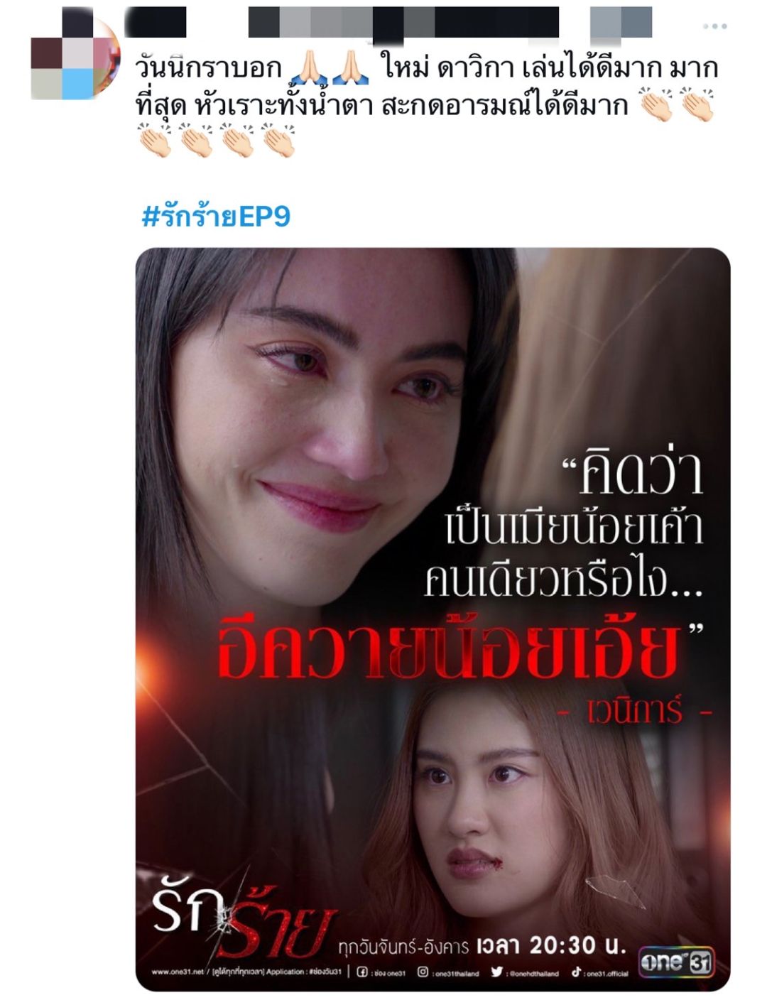 *** สามารถรับชม ละครใหม่!! “รัก/ร้าย” ดูทีวี ทางช่องวัน31 และดูออนไลน์ ทางแอปฯ oneD ที่แรก!! ที่เดียว!! ดาวน์โหลดฟรี!! ดูบนแอป : https://oned.page.link/LoveHurtapp , ดูบนเว็บ : https://bit.ly/LoveHurtweb