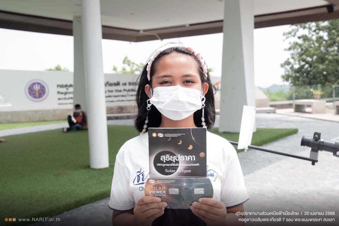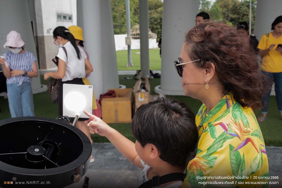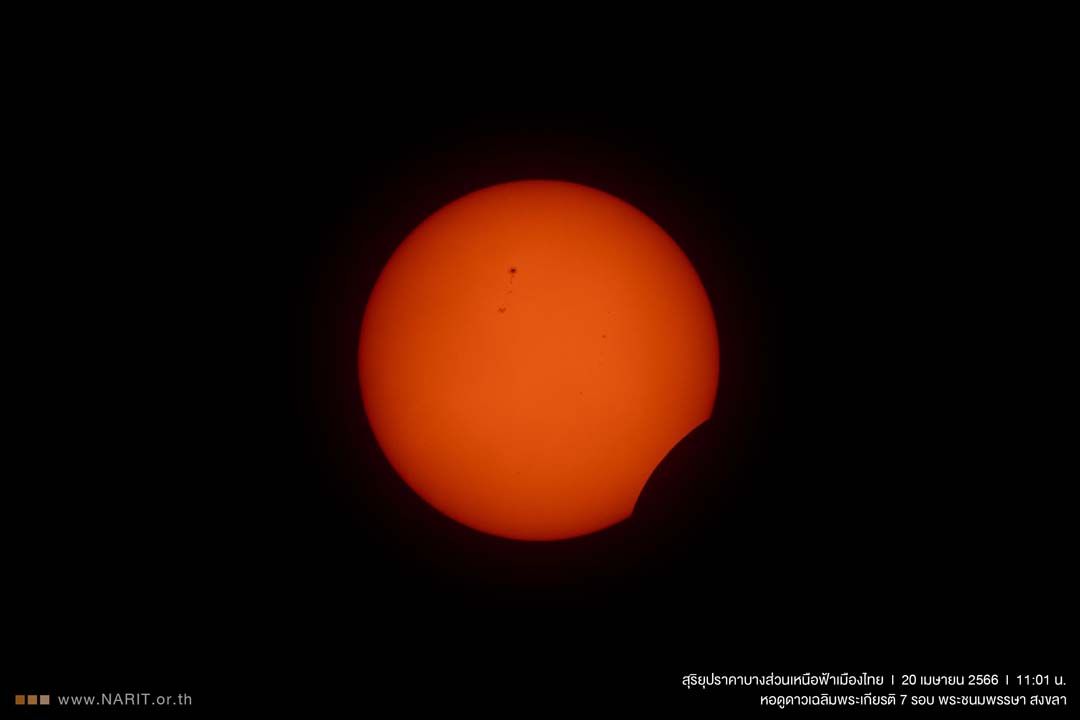 เมื่อวันที่ 20 เมษายน 2566 สถาบันวิจัยดาราศาสตร์แห่งชาติ (องค์การมหาชน) (สดร.) กระทรวงการอุดมศึกษา วิทยาศาสตร์ วิจัย และนวัตกรรม (อว.) เผยภาพ “สุริยุปราคาบางส่วนเหนือฟ้าเมืองไทย” วันที่ 20 เมษายน 2566 ขณะดวงอาทิตย์ปรากฏเว้าแหว่งมากที่สุดร้อยละ 1.82 เวลา 11.01 น.บันทึกผ่านกล้องโทรทรรศน์ติดแผ่นกรองแสงพอลิเมอร์ดำ ณ หอดูดาวเฉลิมพระเกียรติ 7 รอบ พระชนมพรรษา สงขลา