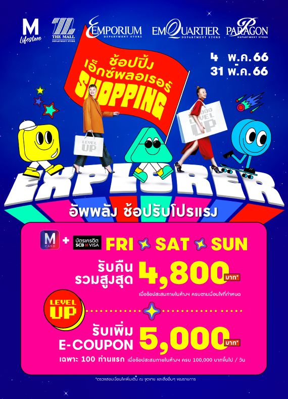 เดอะมอลล์ กรุ๊ป ร่วมกับ ธนาคารไทยพาณิชย์ จัดแคมเปญพิเศษ “Shopping Explorer”อัพพลัง ช้อปรับโปรแรง ทุกวันศุกร์ เสาร์ อาทิตย์สำหรับ สมาชิกบัตร M Cardและบัตรเครดิต SCB M VISA รับคืนรวมสูงสุด 4,800 บาท ระหว่างวันที่ 4 – 31 พฤษภาคม 2566 ที่ห้างสรรพสินค้าเดอะมอลล์และเดอะมอลล์ไลฟ์สโตร์ ทุกสาขา, ดิ เอ็มโพเรียม, ดิ เอ็มควอเทียร์ และ พารากอน ดีพาร์ทเม้นท์สโตร์