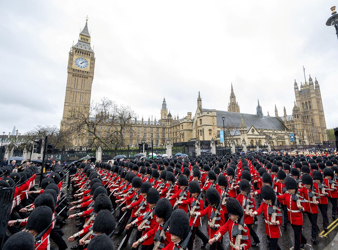 ทหารจากกองทัพอังกฤษ ทั้งกองทัพเรือ กองทัพบก กองทัพอากาศ และกองกำลังจาก 33 ประเทศในเครือจักรภพและดินแดนโพ้นทะเลของอังกฤษ 6 แห่ง มากกว่า 5,000 นาย ในชุดเครื่องแบบเต็มยศ เดินทางโดยรถไฟเซาท์ เวสเทิร์น 7 ขบวนและรถไฟเวสต์ โคสต์ 2 ขบวน ถึงสถานีลอนดอน วอเตอร์ลู กรุงลอนดอน ตั้งแต่เวลาประมาณ 06.00 น. ตามเวลาท้องถิ่น สร้างความฮือฮาตื่นตาตื่นใจให้แก่ผู้พบเห็น นับเป็นการเคลื่อนพลครั้งใหญ่สุดของทหารบนเส้นทางรถไฟของอังกฤษ นับตั้งแต่พิธีฝังศพของเซอร์ วินสตัน เชอร์ชิล อดีตนายกรัฐมนตรีอังกฤษในปี 2508 จากนั้นเหล่าทหารเดินแถวข้ามสะพานเวสต์มินสเตอร์เพื่อรวมพลประจำตำแหน่งและเดินขบวนก่อนเริ่มพระราชพิธีบรมราชาภิเษก