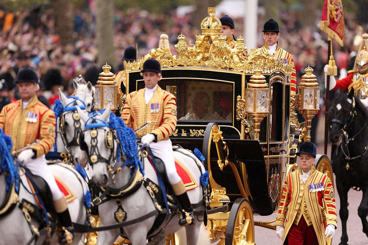 เมื่อประกอบพระราชพิธีเสร็จ สมเด็จพระเจ้าชาร์ลส์ที่ 3 เปลี่ยนพระมหามงกุฎเซนต์เอ็ดเวิร์ดที่ทรงอยู่เป็นพระมหามงกุฎอิมพีเรียล และทรงฉลองพระองค์คลุมอิมพีเรียล ก่อนเสด็จออกจากมหาวิหารเวสต์มินสเตอร์กลับไปยังพระราชวังบั๊กกิ้งแฮม ในระหว่างนั้นมีการบรรเลงเพลงชาติของสหราช อาณาจักร จากนั้น ทั้ง 2 พระองค์เสด็จพระราช ดำเนินกลับไปยังพระราชวังบั๊กกิ้งแฮม โดยใช้เส้นทางเดิม แต่เปลี่ยนมาประทับราชรถม้าทองคำ อายุเก่าแก่ 260 ปี ที่ถูกใช้ครั้งแรกในรัชสมัยของสมเด็จพระเจ้าจอร์จที่ 3 เพื่อเสด็จพระราชดำเนินทรงเปิดประชุมรัฐสภาในปี 2305 และใช้ในพระราชพิธีบรมราชาภิเษกเรื่อยมานับตั้งแต่สมเด็จพระเจ้าวิลเลียมที่ 4 เมื่อปี 2374 โดยราชรถม้าพระที่นั่งสีทองน้ำหนัก 4 ตัน ความยาว 7 เมตร ต้องใช้ม้าสีเทาฝึกพิเศษ วินด์เซอร์ เกรย์ ถึง 8 ตัว ในการลากจูง ขณะที่พสกนิกรได้มีโอกาสชื่นชมราชรถคันนี้เมื่อครั้งฉลองสิริราชสมบัติครบ 70 ปี สมเด็จพระราชินีนาถเอลิซาเบธที่ 2 เมื่อปีที่แล้ว ขณะที่เจ้าชายแห่งเวลส์และพระชายา รวมทั้งพระโอรสและพระธิดาทั้ง 3 พระองค์ ได้แก่ เจ้าชายจอร์จ เจ้าหญิงชาร์ล็อตต์ และเจ้าชายลูอิส ทรงประทับในราชรถตามหลังราชรถทองคำในขบวนเสด็จขากลับด้วย ท่ามกลางสายฝนที่ตกลงมาอย่างต่อเนื่อง