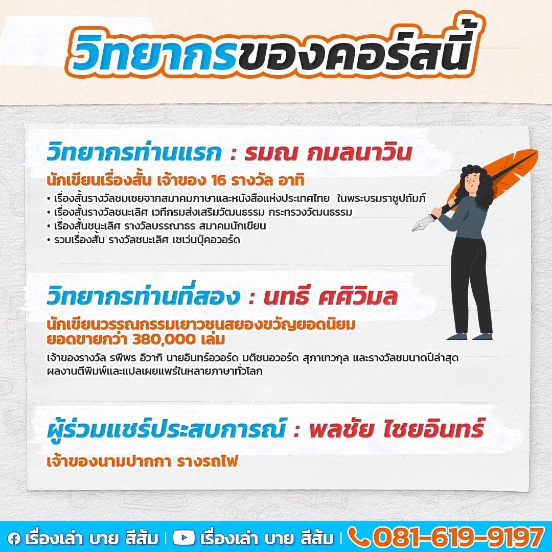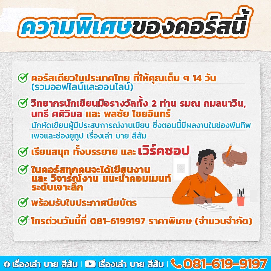 พิเศษกว่าเดิมกับคอร์สเดียวที่เคียงข้างคุณ เต็มๆ 14 วัน ทั้งออนไลน์และออฟไลน์ ที่สอนโดยวิทยากรนักเขียนมือรางวัลถึง 2 ท่าน รับฟังประสบการณ์จากนักหัดเขียนที่มีงานเขียนลงในพันทิป และ เพจ เรื่องเล่า บาย สีส้ม เรียนสนุก เป็นขั้นตอน เข้าใจง่าย มีการแบ่งฐานการเรียนรู้เพื่อเจาะลึกแต่ละทักษะ พร้อมค้นหาศักยภาพและแนวทางการเขียนของตัวเอง โดยเผยทุกเทคนิค ตอบทุกคำถาม ที่ผู้เข้าอบรมจะได้เรียนรู้วิธีการทำงานแบบนักเขียน รู้จริง รู้ลึก ในการเป็นนักเขียนมืออาชีพ ได้เขียนงานจริง พร้อมวิจารณ์ แนะแนวจุดบกพร่องให้แก้ไข สร้างความโดดเด่นในงานเขียนของตัวเอง พร้อมรับใบประกาศทันทีเมื่อเรียนจบ