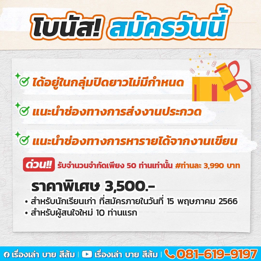 สำหรับผู้สมัครวันนี้จะได้อยู่ในกลุ่มปิดยาวไม่มีกำหนด แนะนำช่องทางการส่งงานประกวด และแนะนำช่องทางการหารายได้จากงานเขียน ซึ่งจัดโดย เพจ “เรื่องเล่า บาย สีส้ม” ของ ประภาพรรณ จุมพลเดชาพันธ์ นักหัดเขียน ผู้จัดคอร์สเปิดโลกสู่การเป็นนักเขียนมืออาชีพ รุ่นที่ 1 ที่นักเขียนยังให้ความสนใจ และผู้มีประสบการณ์ดูแลคลาสเรียน Online นักเรียนกว่า 100 คน