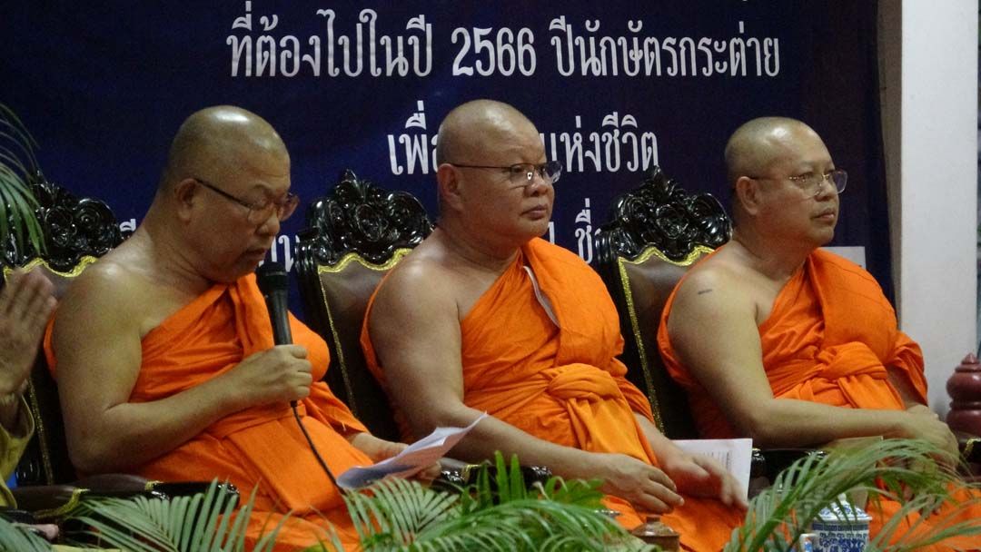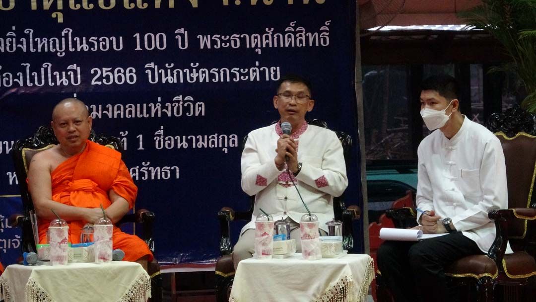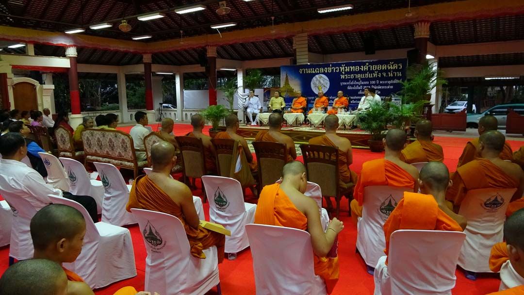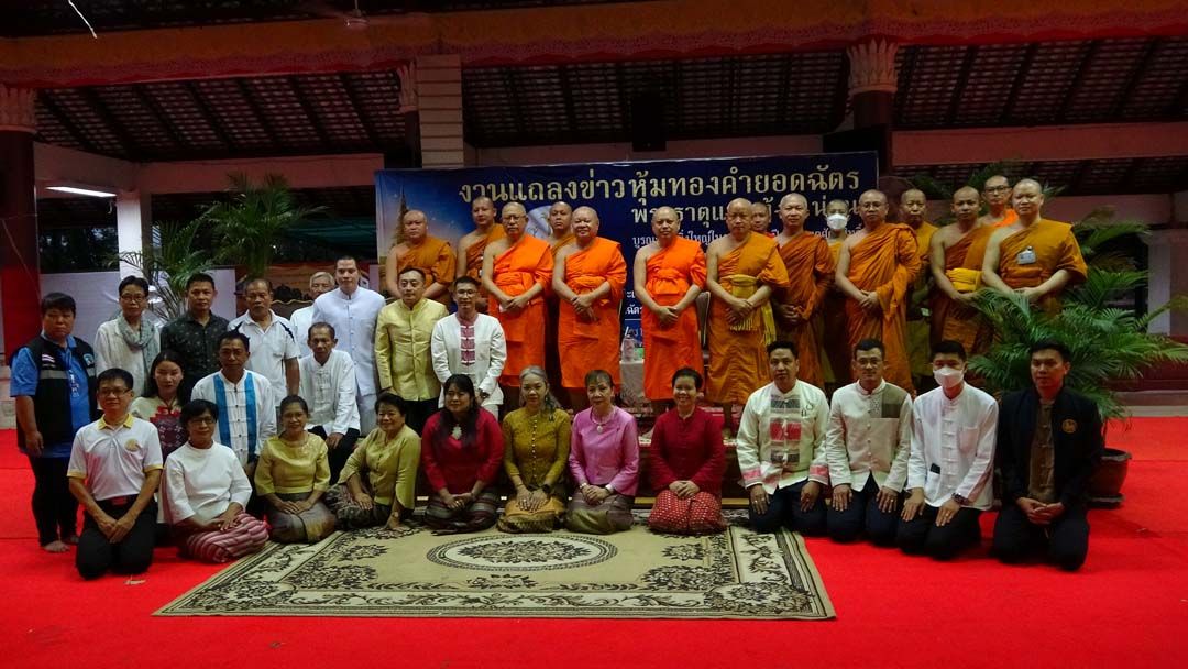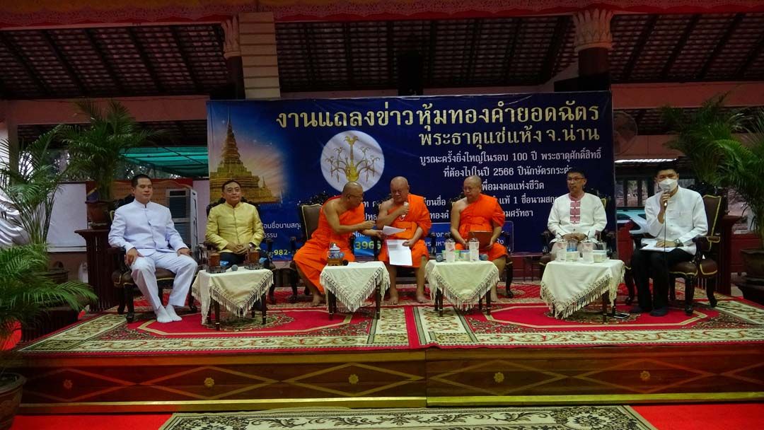 ที่ศาลาหลวง วัดพระธาตุภูเพียงแช่แห้งพระอารามหลวง อำเภอภูเพียง จังหวัดน่าน เมื่อวันที่ 8 พฤษภาคม 2566 พระราชศาสนาภิบาล ประธานอำนวยการฝ่ายสงฆ์จังหวัดน่าน พระสุนทรมุนี รองเจ้าคณะจังหวัดน่าน ประธานดำเนินงานบูรณะปฏิสังขรณ์ฯ คณะสงฆ์จังหวัดน่าน พระชยานันทมุนี รองเจ้าคณะจังหวัดน่าน เจ้าอาวาสวัดพระธาตุแช่แห้ง พระอารามหลวง พร้อมด้วยนายวิบูรณ์ แววบัณฑิต ผู้ว่าราชการจังหวัดน่าน ประธานมูลนิธิพุทธภูมิธรรม ประธานอำนวยการมูลนิธิพุทธภูมิธรรม หัวหน้าส่วนราชการ และสื่อมวลชน เข้าร่วมงานแถลงข่าวบูรณะยอดฉัตรทองคำประดับองค์พระมหาธาตุเจ้าภูเพียงแช่แห้ง เพื่อถวายเป็นพุทธบูชาบูรณะครั้งใหญ่ที่สุดในรอบ 100 ปี