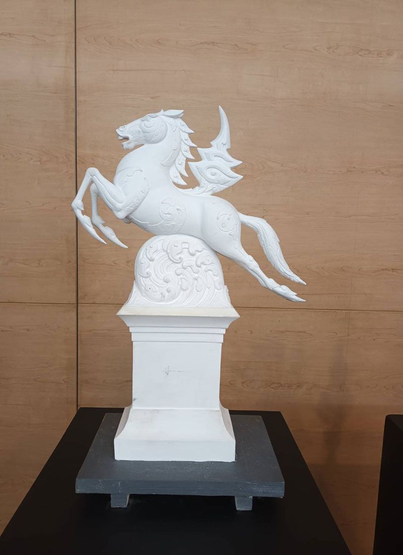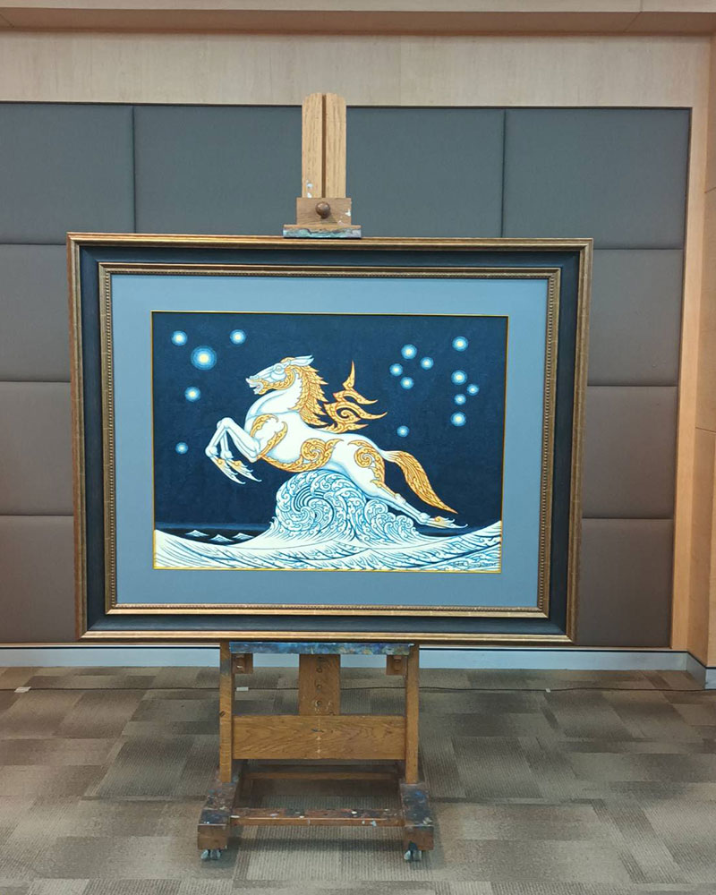 อาจารย์ช่วง มูลพินิจ ได้ให้นิยามของการออกแบบถ้วยรางวัลในครั้งนี้ว่า ถ้วยรางวัลมีชื่อว่า สันโตสะอาชาไนย เป็นรูปม้ากระโจนเหนือคลื่น มีความหมายว่า ผู้ที่ถูกฝึกหัดด้านความพอเพียงมาอย่างดีแล้ว แต่ละส่วนจะมีนัยยะ อาทิ คลื่น หมายถึง กระแสสังคม ความเห็นของคนส่วนใหญ่ในโลกแห่งวัตถุนิยม เปรียบประดุจภาพคลื่นที่ถาโถมเข้ามาเป็นอุปสรรคในการก้าวข้าม เลข ๙ หมายถึง ตัวแทนของ “หลักปรัชญาของเศรษฐกิจพอเพียง” ที่พึงระลึกอยู่ในใจเสมอ เช่นเดียวกับอานบนหลังม้าที่ถูกฝึกฝนมาแล้ว ส่วนม้า หมายถึง ผู้ที่ฝึกตน ปฏิบัติตามหลักปรัชญาของเศรษฐกิจพอเพียง มีความมุ่งมั่นฝ่าฝันกับคลื่นของสังคมลูกแล้วลูกเล่า และสุดท้าย “ผู้ที่ฝึกตนดีแล้วก็จะสามารถก้าวข้ามกระแสโลกแห่งวัตถุนิยมไปได้”