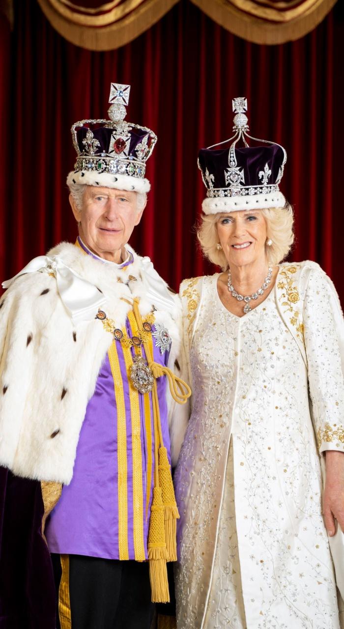 ขณะที่พระบรมฉายาลักษณ์ภาพที่ 2 เป็นภาพของ สมเด็จพระเจ้าชาร์ลส์ที่ 3 และสมเด็จพระราชินีคามิลลา ทรงฉายพระบรมฉายาลักษณ์ร่วมกับเด็กชายที่ถือฉลองพระองค์เสื้อคลุมในพระราชพิธีบรมราชาภิเษก และสตรีที่รับหน้าที่ดูแลสมเด็จพระราชินีคามิลลาในพระราชพิธี