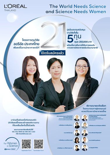 โครงการทุนวิจัย ลอรีอัล ประเทศไทย เพื่อสตรีในงานวิทยาศาสตร์ ปีที่ 21 เปิดรับสมัครนักวิจัยสตรีไทย อายุไม่เกิน 40 ปี เจ้าของงานวิจัยอิสระในสาขาวิทยาศาสตร์กายภาพ หรือวิทยาศาสตร์ชีวภาพ ที่ยังอยู่ในระหว่างการดำเนินการ พร้อมมอบทุนสูงสุดจำนวน 5 ทุน ทุนละ 250,000 บาท และโล่เกียรติคุณ