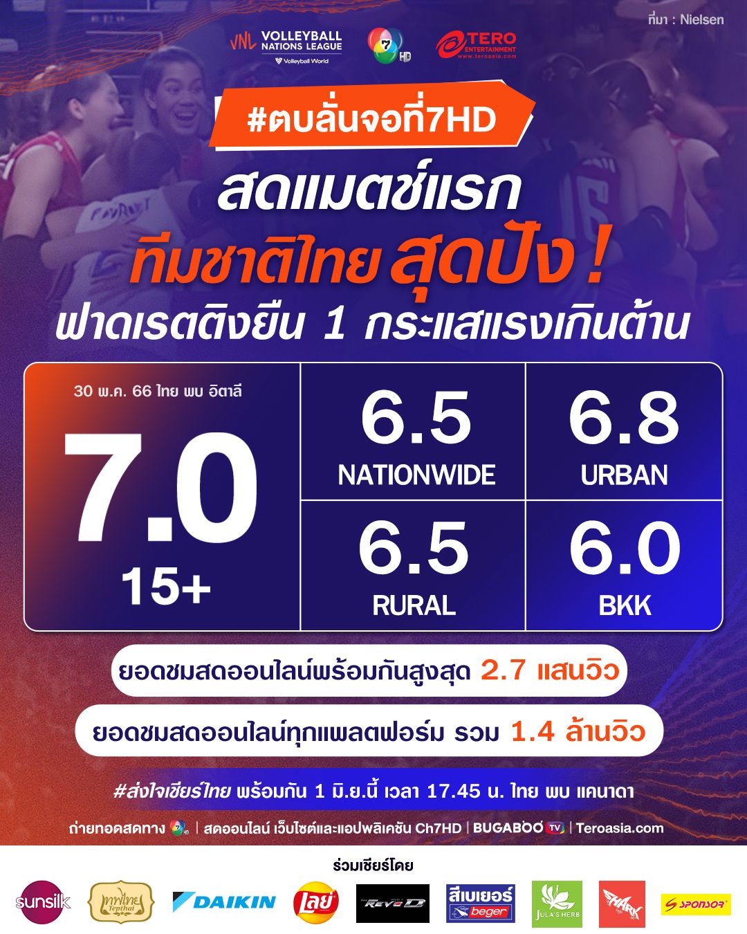 แฟนลูกยางอย่าพลาด! เปิดจอรอปักหมุดเชียร์ลูกยางสาวไทยและทีมชั้นนำระดับโลก #ตบลั่นจอที่7HDพร้อมกันทั่วประเทศทางช่อง7HD กด 35 รวมทั้งช่องทางเว็บไซต์แอปพลิเคชัน Ch7HD และ BUGABOO.TV และทางเว็บไซต์ https://teroasia.comตั้งแต่เดือนพฤษภาคม – กรกฎาคม 2566 และเกาะติดขอบสนามไทย ร่วมเชียร์อย่างใกล้ชิดในสัปดาห์ที่ 3 ของการแข่งขันรอบแรกวันที่ 27 มิถุนายน – วันที่2 กรกฎาคม 2566 ณอินดอร์ สเตเดียม หัวหมากโดยการถ่ายทอดสดการแข่งขัน Volleyball Nations League(VNL) ในปีนี้ ได้รับการสนับสนุนจากสินค้าชั้นนำมากมาย อาทิ แชมพู ซันซิล สมูท แอนด์ เมเนจเจเบิ้ล, ยาสีฟันเทพไทย, เครื่องปรับอากาศไดกิ้น, มันฝรั่งแท้ทอดกรอบ เลย์, ใหม่ ไฮลักซ์ รีโว่ดี, สีเบเยอร์คูล ไดมอนด์ชิลด์, ผลิตภัณฑ์บำรุงผิวหน้า จุฬาเฮิร์บ, ชาร์ค กลิ่นอุเมะ โซดา, เครื่องดื่มเกลือแร่สปอนเซอร์ และบ้านกรองน้ำ