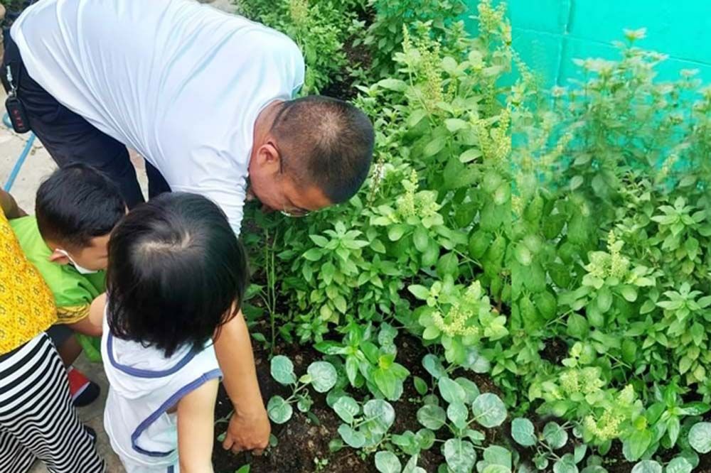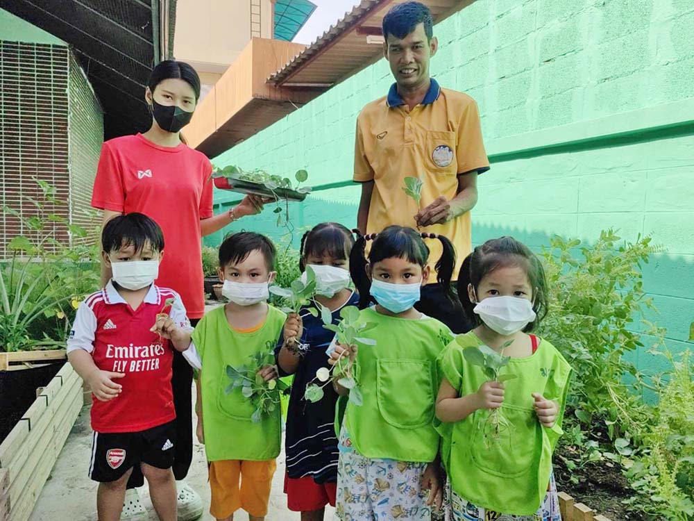 เป็นแปลงผักพืชสมุนไพร ทั้งกะเพราโหระพา พริกขี้หนู ข้างๆ กันเป็นแปลงปลูกฟักทองที่กำลังติดออกดอกออกผล อีกมุมเป็นกระบะเพาะพันธุ์ผัก มีคะน้าต้นอ่อนกำลังแข่งกันโต โดยมีน้องๆ ก่อนวัยเรียน ที่ต่างง่วนกับการเก็บต้นอ่อนคะน้าสำหรับเมนูกลางวัน ข้าวผัดไก่กับไข่ใส่ผักคะน้าที่น้องๆ เรียกว่าเบบี้คะน้า ทุกคนแย่งกันเล่าว่าชอบกินเบบี้คะน้ามากๆ เพราะไม่มีรสขมเลยบางวันครูปัทแม่ครัวคนเก่ง ก็ทำบะหมี่ผัดใส่ไส้กรอกกับคะน้าแสนอร่อยให้ทานด้วย