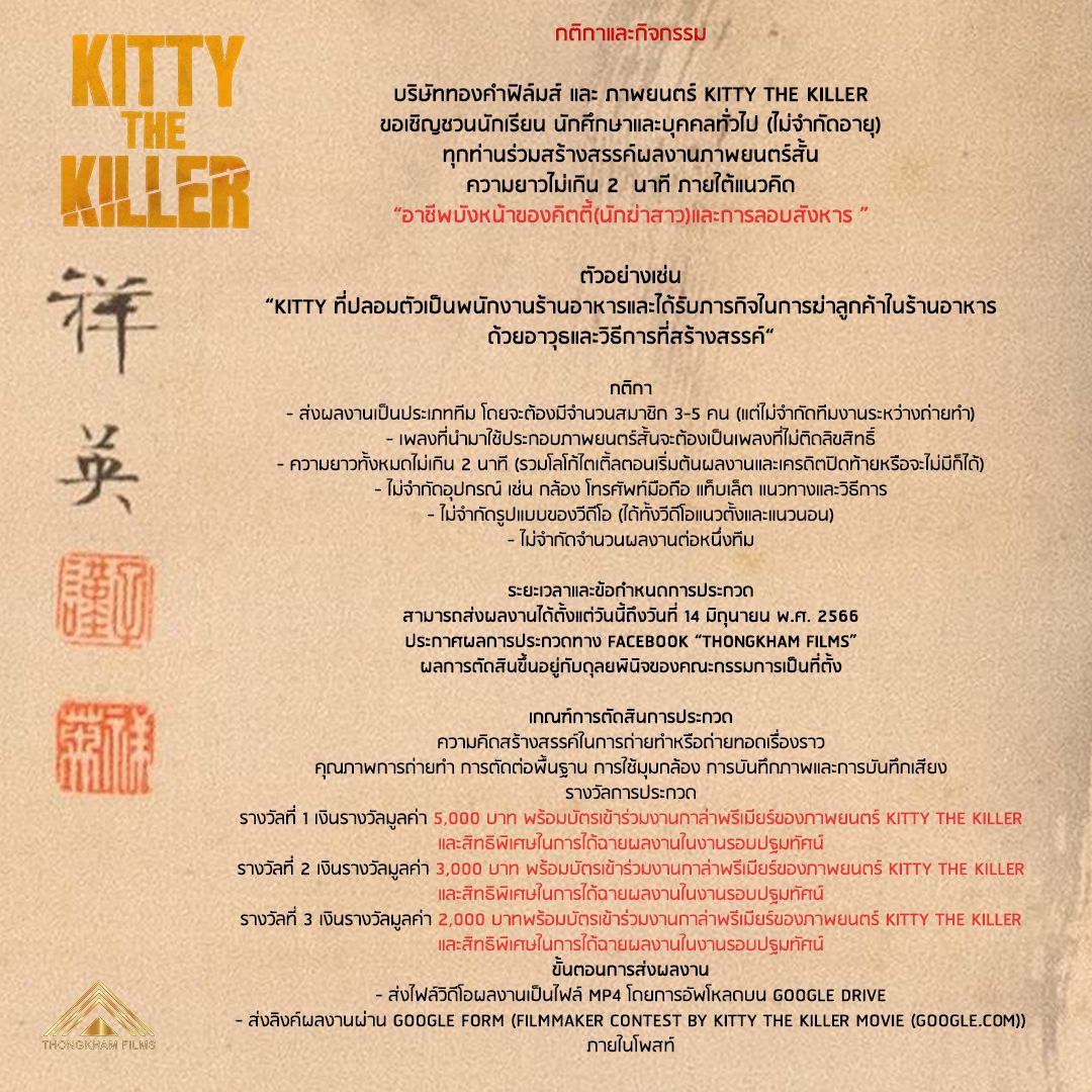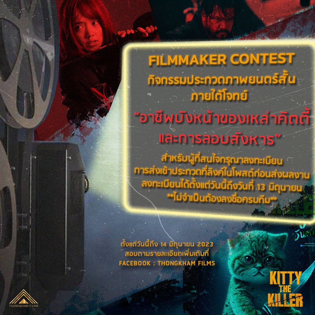 โอกาสดีไม่ได้มีมาบ่อย ๆ บริษัท“ทองคำฟิล์มส์” และ ภาพยนตร์“KITTY THE KILLER”ขอเชิญชวนนักเรียน นักศึกษา และบุคคลทั่วไป (ไม่จำกัดอายุ) ร่วมสร้างสรรค์ผลงานภาพยนตร์สั้น ความยาวไม่เกิน 2 นาที ภายใต้แนวคิด “อาชีพบังหน้าของคิตตี้(นักฆ่าสาว) และการลอบสังหาร” ตัวอย่างเช่น “KITTY ที่ปลอมตัวเป็นพนักงานร้านอาหารและได้รับภารกิจในการฆ่าลูกค้าในร้านอาหาร ด้วยอาวุธ และวิธีการที่สร้างสรรค์” ใน FILMMAKER CONTEST กิจกรรมประกวดภาพยนตร์สั้น