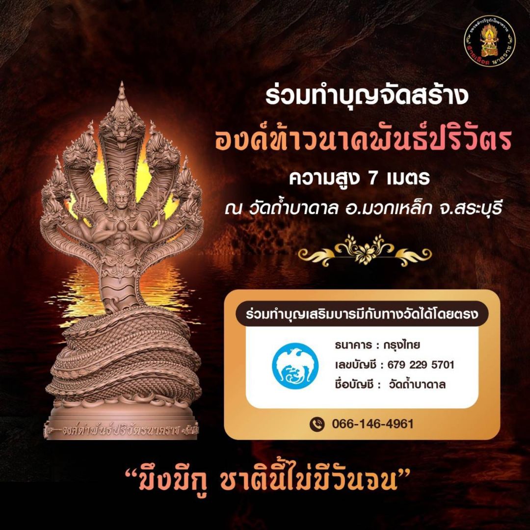 ร่วมสร้างองค์ท้าวนาคพันธ์ปริวัตรกับทางวัดได้โดยตรงที่ ธนาคารกรุงไทยเลขที่บัญชี 679 229 5701ชื่อบัญชี วัดถ้ำบาดาล