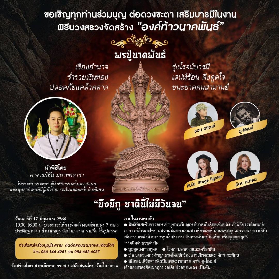 แรงศรัทธาอ้อย กะท้อน นำทัพเพื่อนศิลปินขึ้นเวทีฟรีคอนเสิร์ต เชิญชวนร่วมบุญใหญ่ 17 มิถุนายนศกนี้ ที่วัดถ้ำบาดาล สระบุรี ในงานบวงสรวงจัดสร้าง “องค์นาคพันธ์” เทวนาคราชผู้ยิ่งใหญ่ สูงขนาด 7 เมตร พร้อมรำถวายภายในงาน