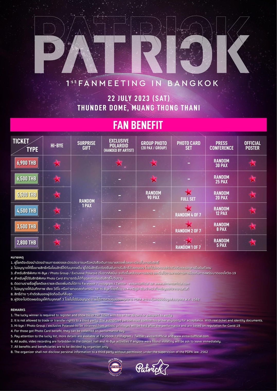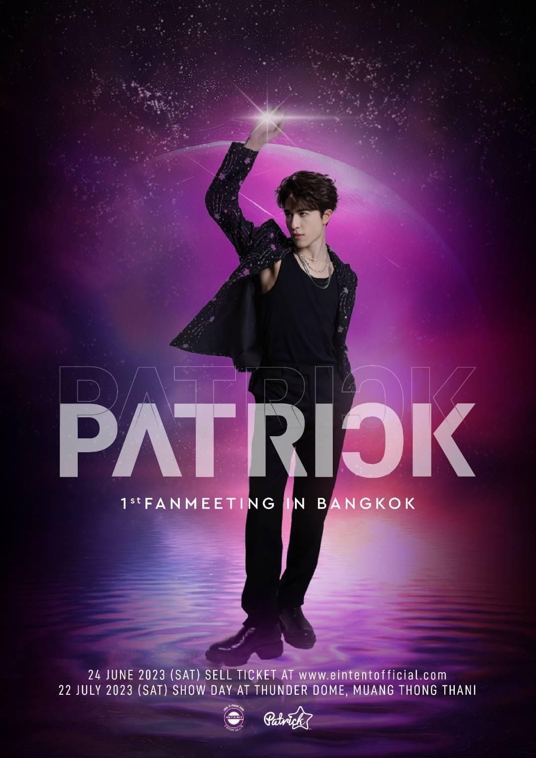 แพทริค ณัฐวรรธ์ ฟิงค์เลอร์” หรือ แพทริค อดีตสมาชิกวง INTO1 หนุ่มน้อยมหัศจรรย์มากความสามารถมีผลงานมากมายทั้งร้องเพลงและการแสดงเตรียมบินลัดฟ้ามาไทย เพื่อพบปะแฟนๆในวัน เสาร์ ที่ 22 กรกฎาคม นี้ ที่ ธันเดอร์โดม เมืองทองธานี กับงาน PATRICK 1st Fan Meeting in Thailand โดยมี บริษัท อี-อินเทนท์ จำกัด (E-Intent Co., Ltd.) เป็นผู้จัดงาน ซึ่งเป็นบริษัทที่คว่ำหวอดนำนักแสดงแถวหน้า นำศิลปินต่างประเทศเข้ามาโหมอีเวนต์ในไทยได้สำเร็จ