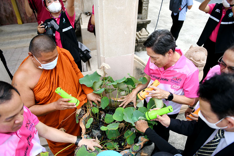 กรมควบคุมโรคจึงร่วมกับจังหวัดปทุมธานี และเครือข่ายที่เกี่ยวข้อง ได้แก่ กรมสนับสนุนบริการสุขภาพ กรมส่งเสริมการปกครองท้องถิ่น องค์การบริหารส่วนจังหวัดปทุมธานี และวิทยาลัยการอาชีวศึกษาปทุมธานี จัดให้มีการรณรงค์ “บ้าน วัด โรงเรียน” พร้อมใจ หยุดภัยไข้เลือดออก สืบเนื่องจากมีการสำรวจลูกน้ำยุงลายโดยอาสาสมัครสาธารณสุขประจำหมู่บ้าน (อสม.)ล่าสุดโดยใช้แอปพลิเคชั่น อสม.ออนไลน์ สำรวจใน 7 สถานที่เสี่ยงที่จะมีการแพร่ระบาดของโรคไข้เลือดออกพบลูกน้ำยุงลายที่วัด โรงเรียน และสถานที่ราชการ มีค่าดัชนีความหนาแน่นสูงสุด จึงจำเป็นต้องสร้างความเข้าใจกับประชาชนให้ถูกต้อง อาทิ วัดเป็นแหล่งที่ผู้คนเข้า-ออกทำบุญอย่างต่อเนื่อง โดยพระสงฆ์ไม่สามารถกำจัดลูกน้ำและยุงลายได้ด้วยตัวเองจึงต้องสร้างความเข้าใจกับประชาชนว่าเข้าวัดอย่าสร้างขยะ เช่น แก้วพลาสติก กล่องโฟมใส่อาหาร ที่อาจกลายเป็นแหล่งเพาะพันธุ์ยุงลายได้ รวมทั้งควรมีจิตอาสาที่จะช่วยกันดูแลสิ่งแวดล้อมในวัดไม่ให้มีแหล่งน้ำขังกลายเป็นแหล่งเพาะพันธุ์ยุงส่วนโรงเรียนต้องมีมาตรการเข้มข้นในการฝึกทักษะนักเรียนให้สามารถจัดการกับปัญหายุงลายได้ เช่น จัดเวรดูแลอ่างบัว แจกันพลูด่าง ปล่อยปลาหางนกยูงเพื่อกินลูกน้ำ เป็นต้น และต้องมีมาตรการป้องกันมิให้ยุงกัดนักเรียน