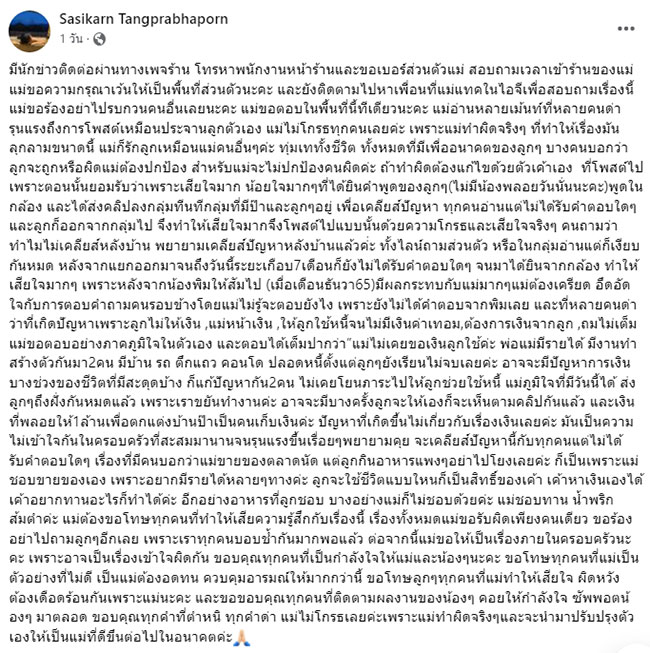 แม่ต้องขอโทษทุกคนที่ทำให้เสียความรู้สึกกับเรื่องนี้ เรื่องทั้งหมดแม่ขอรับผิดเพียงคนเดียว ขอร้องอย่าไปถามลูกๆ อีกเลย เพราะเราทุกคนบอบช้ำกันมากพอแล้ว ต่อจากนี้แม่ขอให้เป็นเรื่องภายในครอบครัวนะคะ เพราะอาจเป็นเรื่องเข้าใจผิดกัน ขอบคุณทุกคนที่เป็นกำลังใจให้แม่และน้องๆ นะคะ