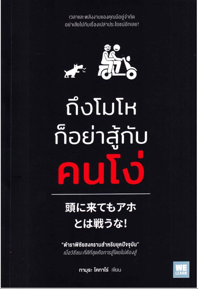 “ถึงโมโหก็อย่าสู้กับคนโง่” ผู้เขียน Tamura Kotaro (ทามุระ โคทาโร่) ผู้แปล ชัญพัส วรศักดิ์ ที่ผ่านมาลองถามตัวเองดูว่า ในชีวิตเคยเสียเวลาอย่างเปล่าประโยชน์ไปกับการโกรธ และการกลุ้มใจ หรือมัวแต่พะวงกับสายตาของคนอื่นบ้างหรือไม่ และถ้าตรวจสอบแล้วพบว่าเสียเวลาให้เรื่องเหล่านั้นมากเหมือนกัน ก็ให้เลิกเสียเถอะ เพราะไร้ประโยชน์จริงๆ เวลาและพลังงานของคนเรามีอยู่อย่างจำกัด ควรทุ่มเทพลังทั้งหมดที่มีให้กับสิ่งที่ควรทำจริง ๆ ดีกว่า “ถึงโมโหก็อย่าสู้กับคนโง่” เป็นหนังสือเล่มเล็กที่ถูกขนานนามว่าเป็น “ตำราพิชัยสงคราม” สำหรับยุคปัจจุบัน ซึ่งจะช่วยให้คุณผู้อ่านชนะได้โดยไม่ต้องเปลืองแรงต่อสู้ ไม่ว่าจะอยู่ในสมรภูมิใดในชีวิตก็ตาม อาทิ ถึงโมโหแค่ไหน ก็อย่าเสียเวลาสู้กับคนโง่ ยิ่งอีกฝ่ายทำตัวน่ารังเกียจ ยิ่งต้องแสร้งทำตัวเป็นเหยื่อ การอ่านความรู้สึกคนคือกุญแจสำคัญของการมีชีวิตรอด จงทำหน้ากลุ้ม แม้จะไม่ได้กลุ้มอยู่ก็ตาม และอื่น ๆ อีกมากมาย ดังนั้น…เลิกต่อสู้อย่างเปล่าประโยชน์ แล้วมุ่งสู่หนทางที่ทำให้ชีวิตมีความสุข ชีวิตมีความมั่นคงกันดีกว่า หนังสือราคาเล่มละ 260 บาท