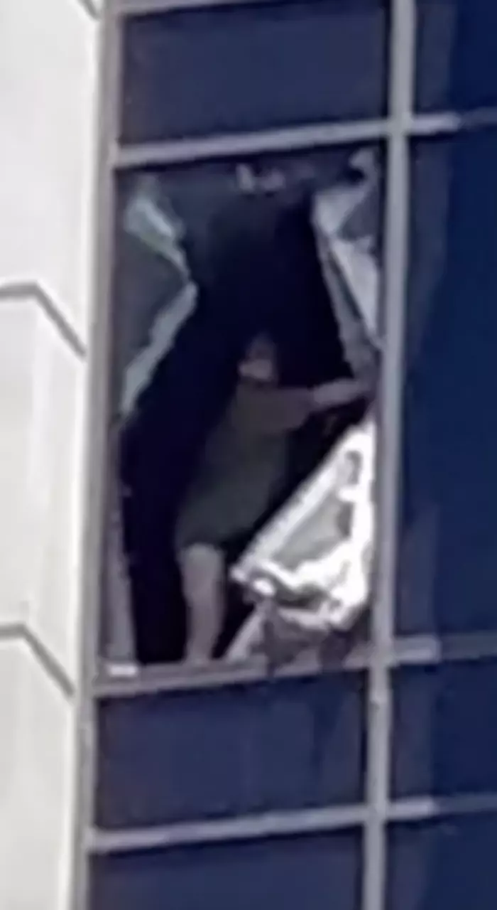 โดยในขณะที่เจ้าหน้าที่ตรึงกำลังอยู่ด้านนอก ชายหนุ่มผู้ก่อเหตุได้ทุบกระจกหน้าต่างของโรงแรมจนแตก และโยนของใช้ในห้องพัก และเฟอร์นิเจอร์ออกมาจากหน้าต่างจากชั้น 21 ของโรงแรมต่อเนื่อง สร้างความตื่นตระหนกให้ผู้เข้าพักคนอื่นๆ ที่อยู่บริเวณสระว่ายน้ำที่อยู่ด้านล่าง