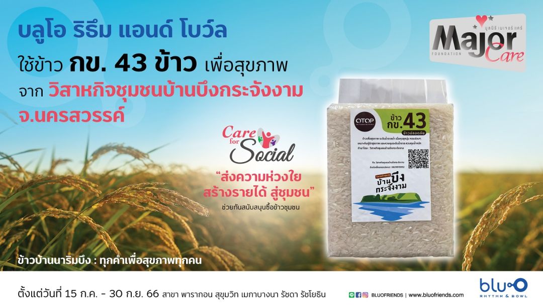 ธนาธร สุวิชา ผู้อำนวยการฝ่ายปฎิบัติการ บริษัท เมเจอร์ โบว์ล กรุ้ป จำกัด กล่าวถึงโครงการ “Care for Social” ว่า เมเจอร์ โบว์ล กรุ้ป เล็งเห็นความสำคัญและอยากร่วมเป็นส่วนหนึ่งในการช่วยขับเคลื่อนให้เกษตรกรไทยมีรายได้สามารถสร้างผลผลิตได้ตั้งแต่ต้นน้ำจนถึงปลายน้ำ จึงเข้าไปช่วยสนับสนุนซื้อเมล็ดข้าวพันธุ์ ข้าวกข 43 จากชุมชนวิสาหกิจบ้านบึงกระจังงาม จ.นครสวรรค์ ซึ่งชุมชนได้ปลูกอย่างพิถีพิถัน โดยข้าวที่ปลูกมีคุณสมบัติโดดเด่นมีเอกลักษณ์เฉพาะของท้องถิ่น คือ มีน้ำตาลในข้าวต่ำกว่าข้าวทั่วไป เมื่อนำมาหุงจะมีความหอมและนุ่ม ดีต่อสุขภาพเหมาะกับผู้ที่รักสุขภาพ ซึ่งการดำเนินการโครงการนี้ไม่เพียงแต่ช่วยสนับสนุนรายได้ให้กับเกษตรกรโดยตรง แต่ยังทำให้ลูกค้าของ เมเจอร์ โบว์ล กรุ้ป ได้ลิ้มรสข้าวออร์แกนิกคุณภาพดีและได้รับสารอาหารที่มีคุณภาพสูง พร้อมนำข้าว กข 43 มาปรุงอาหารที่มีคุณค่าทางโภชนาการสำหรับลูกค้าที่มาใช้บริการที่ บลูโอ ริธึม แอนด์ โบว์ล ตั้งแต่วันที่ 15 กรกฎาคม – 30 กันยายน 2566 ใน 5 สาขา ได้แก่ บลูโอ ริธึม แอนด์ โบว์ล สาขาพารากอน, รัชโยธิน, สุขุมวิท, เมกา บางนา และ เอสพลานาด รัชดา
