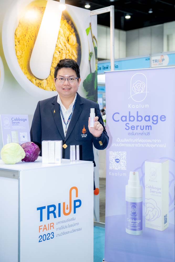 ราชวิทยาลัยจุฬาภรณ์ แสดงผลงานวิจัยสู่นวัตกรรม“เซรั่มกะหล่ำปลี” ภายใต้แบรนด์ Kaalum (กะหล่ำ) ในงาน TRIUP FAIR 2023 มหกรรมส่งเสริมการใช้ประโยชน์จากงานวิจัยและนวัตกรรม ประจำปี 2566 ต่อยอดเชิงพาณิชย์กับภาคอุตสาหกรรมไทย จัดโดย สำนักงานคณะกรรมการส่งเสริมวิทยาศาสตร์ วิจัยและนวัตกรรม (สกสว.) ภายใต้แนวคิด “Journey to Impact : เส้นทางจากงานวิจัยนวัตกรรมสู่การยกระดับเศรษฐกิจและสังคมของประเทศ