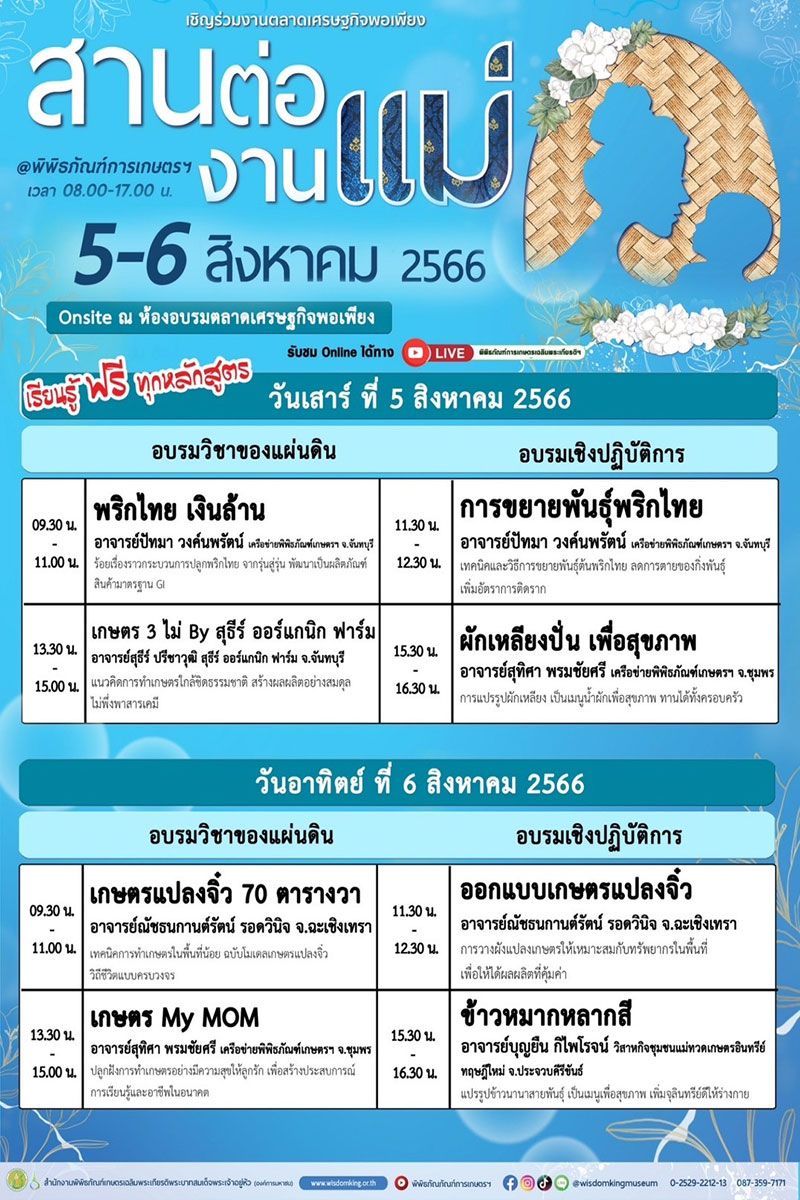 นิทรรศการเทิดพระเกียรติสมเด็จพระนางเจ้าสิริกิติ์ พระบรมราชินีนาถ พระบรมราชชนนีพันปีหลวง ถ่ายทอดหัตถกรรมโบราณจากเส้นด้ายผ่านกี่ทอ ร้อยเรียงเป็นลายผ้าถ่ายทอดอัตลักษณ์ของท้องถิ่น มรดกอันล้ำค่าของชนชาวไทยเปิดหลักสูตรอบรมฟรี สร้างอาชีพ ผ่านวิชาของแผ่นดินและอบรมเชิงปฏิบัติการกับเกษตรกรตัวจริงเสียงจริงที่มาถ่ายทอดองค์ความรู้ด้านการเกษตร อาทิหลักสูตรพริกไทย เงินล้าน และการขยายพันธุ์พริกไทย โดยอาจารย์ปัทมา วงค์นพรัตน์ เครือข่ายพิพิธภัณฑ์เกษตรฯ จ.จันทบุรี หลักสูตรผักเหลียงปั่น เพื่อสุขภาพ และหลักสูตรเกษตร My MOM โดยอาจารย์สุทิศา พรมชัยศรี เครือข่ายพิพิธภัณฑ์เกษตรฯ จ.ชุมพร หลักสูตรเกษตรแปลงจิ๋ว 70 ตารางวา และหลักสูตรออกแบบเกษตรแปลงจิ๋ว โดยอาจารย์ณัชธนกานต์รัตน์ รอดวินิจ จ.ฉะเชิงเทรา เป็นต้น ในรูปแบบ Onsite และรูปแบบ Online สามารถรับชมพร้อมกันทั่วประเทศ โดยถ่ายทอดสดผ่านทาง Youtube live พิพิธภัณฑ์การเกษตรเฉลิมพระเกียรติฯนิทรรศการเครือข่ายพิพิธภัณฑ์เกษตรฯ “มัลเบอร์รี่ของดีบำรุงแม่” พบกับนางสาวสายชล ธำรงโชติ เครือข่ายพิพิธภัณฑ์เกษตรฯ จ.ชัยนาท ชวนคุณแม่มาร่วมสนุกทำสบู่กระดาษมัลเบอร์รี่พกพา ลงมือปฏิบัติ สบู่เหลว มัลเบอร์รี่ และชาใบหม่อนเพื่อสุขภาพสำหรับคุณแม่ ช่วยลดน้ำตาล ลดความดัน และไขมัน พิเศษภายในงาน มีแจกกล้าพันธุ์หม่อนใบและหม่อนผล ในจำนวนจำกัด