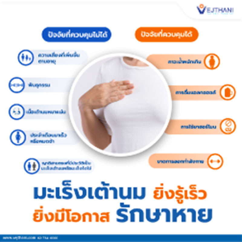 l ปัจจัยที่ไม่สามารถควบคุมได้ เช่น ความเสี่ยงที่เพิ่มขึ้นตามอายุ, มีการถ่ายทอดทางพันธุกรรมในครอบครัว, มีญาติสายตรงที่มีประวัติเป็นมะเร็งเต้านมหรือมะเร็งรังไข่, การมีประจำเดือนเร็วและหมดประจำเดือนช้า,เคยมีประวัติการฉายแสงบริเวณหน้าอกมาก่อน, และการมีภาวะเนื้อเต้านมหนาแน่น ซึ่งจะทราบได้โดยการทำแมมโมแกรม