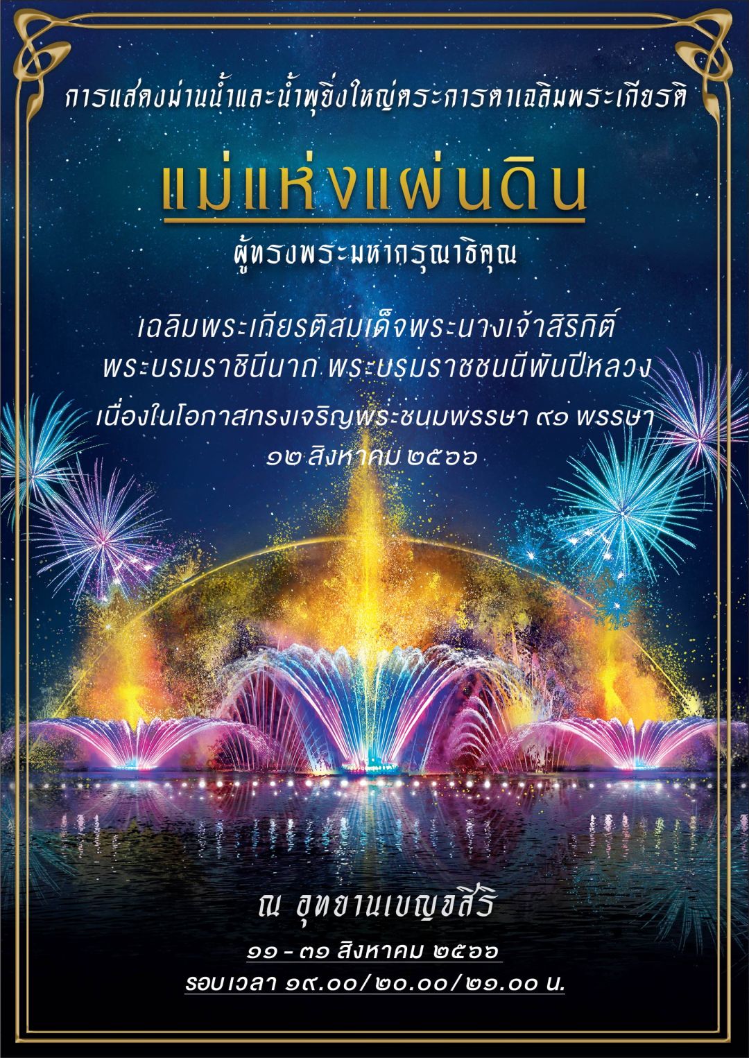 การแสดง “ม่านน้ำแห่งพระมหากรุณาธิคุณ แม่แห่งแผ่นดิน” จัดขึ้นเพื่อเฉลิมพระเกียรติสมเด็จพระนางเจ้าสิริกิติ์ พระบรมราชินีนาถ พระบรมราชชนนีพันปีหลวง เนื่องในโอกาสทรงเจริญพระชนมพรรษา 91 พรรษา ในวันที่ 12 สิงหาคม นี้ เนื้อหาการจัดแสดงถ่ายทอดเรื่องราวพระราชประวัติ พระอัจฉริยภาพ และพระราชกรณียกิจต่างๆ ในสมเด็จพระนางเจ้าสิริกิติ์ พระบรมราชินีนาถ พระบรมราชชนนีพันปีหลวง ที่มีต่อปวงชนชาวไทยมาอย่างยาวนาน และพลาดไม่ได้ ที่ปวงชนชาวไทยจะได้ชื่นชมพระบารมีผ่านพระฉายาลักษณ์ในการแสดงม่านน้ำพุในครั้งนี้