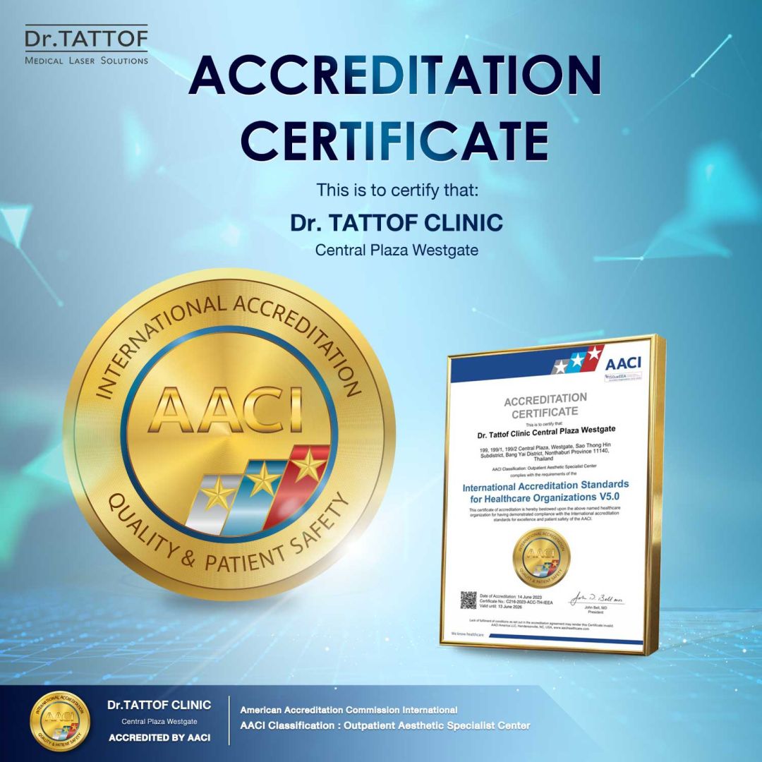 การผ่านการรับรองมาตรฐานสากล AACI ในครั้งนี้เป็นการสร้างความเชื่อมั่นและไว้วางใจให้กับผู้รับบริการได้ว่า Dr.TATTOFมุ่งเน้นให้ความสำคัญเรื่องความปลอดภัยของผู้รับบริการให้เข้ากับมาตรฐานสากลสูงสุด เพื่อผลลัพธ์ของการรักษาที่มีประสิทธิภาพ เห็นผลและปลอดภัย ทั้งนี้เพื่อรองรับผู้รับบริการ และนักท่องเที่ยวต่างชาติเข้ามาใช้บริการในอนาคตต่อไป