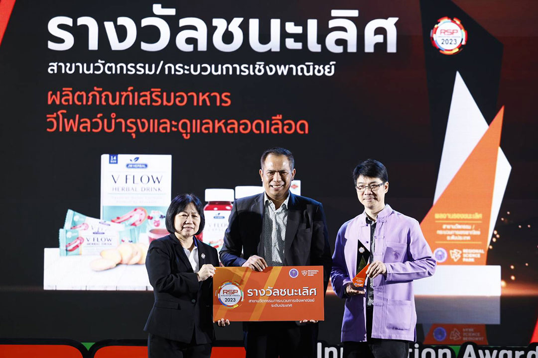 ด้านรางวัลชนะเลิศ สาขากระบวนการ/นวัตกรรมเชิงพาณิชย์ ได้แก่ ผลงาน ผลิตภัณฑ์เสริมอาหาร “ V Flow 3” คุณวิสิษฐ กอวรกุล บริษัทเจดับบลิว เฮอร์เบิล จำกัด จากมหาวิทยาลัยเชียงใหม่ เป็นผลิตภัณฑ์สมุนไพร ขิง พุทราจีน เห็ดหูหนูดำ เพื่อการดูแลสุขภาพและหลอดเลือด ซึ่งได้พัฒนารูปแบบสารสกัด ชนิดชงดื่มและชนิดเม็ด ให้อยู่ในรูปแบบผลิตภัณฑ์ที่ทานง่าย สะดวก โดยยังคงคุณสมบัติที่มีประโยชน์ไว้อย่างครบถ้วน